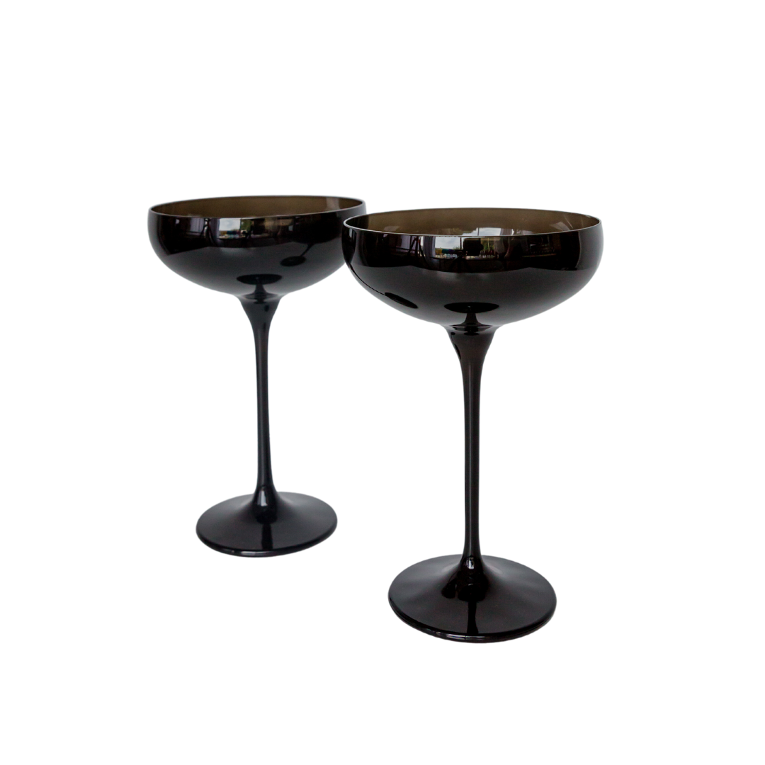This set of two champagne coupe glasses brings a modern and minimalist charm to your glassware. Crafted from high – quality dark – tinted glass, likely smoked or blackened, they feature a wide, shallow bowl and a long, slender stem. The seamless design with smooth curves and a reflective finish makes them both functional for serving drinks and visually appealing.