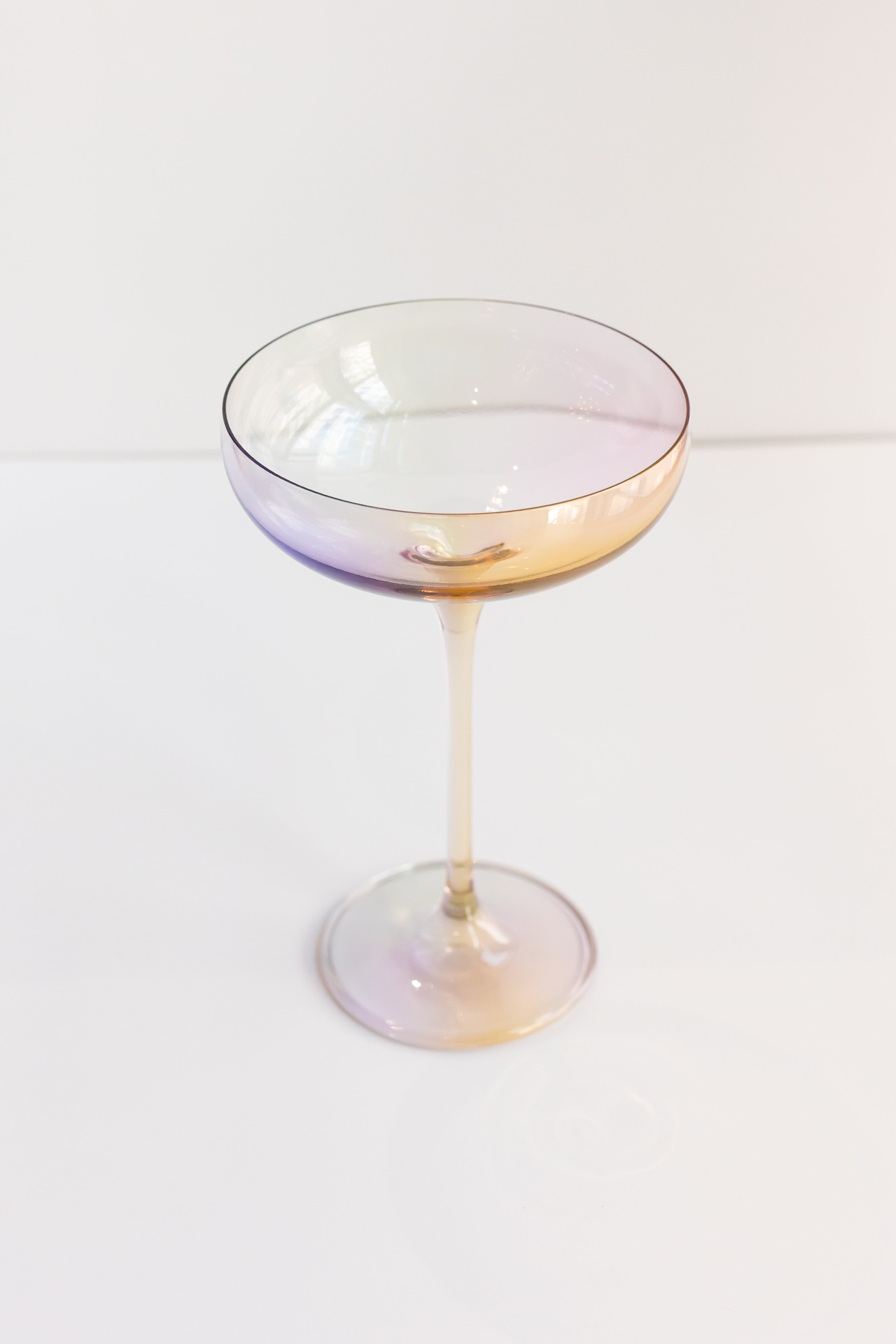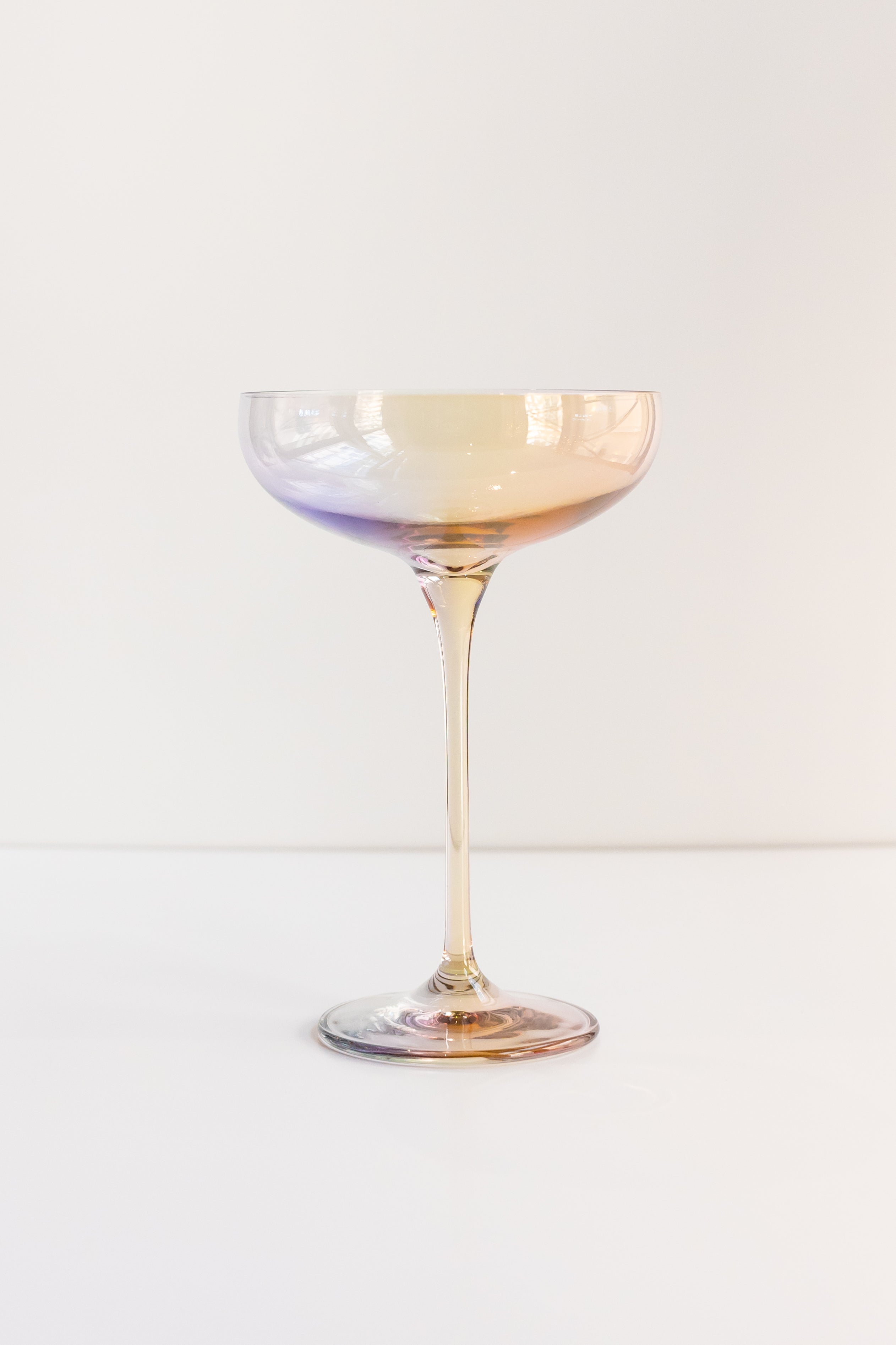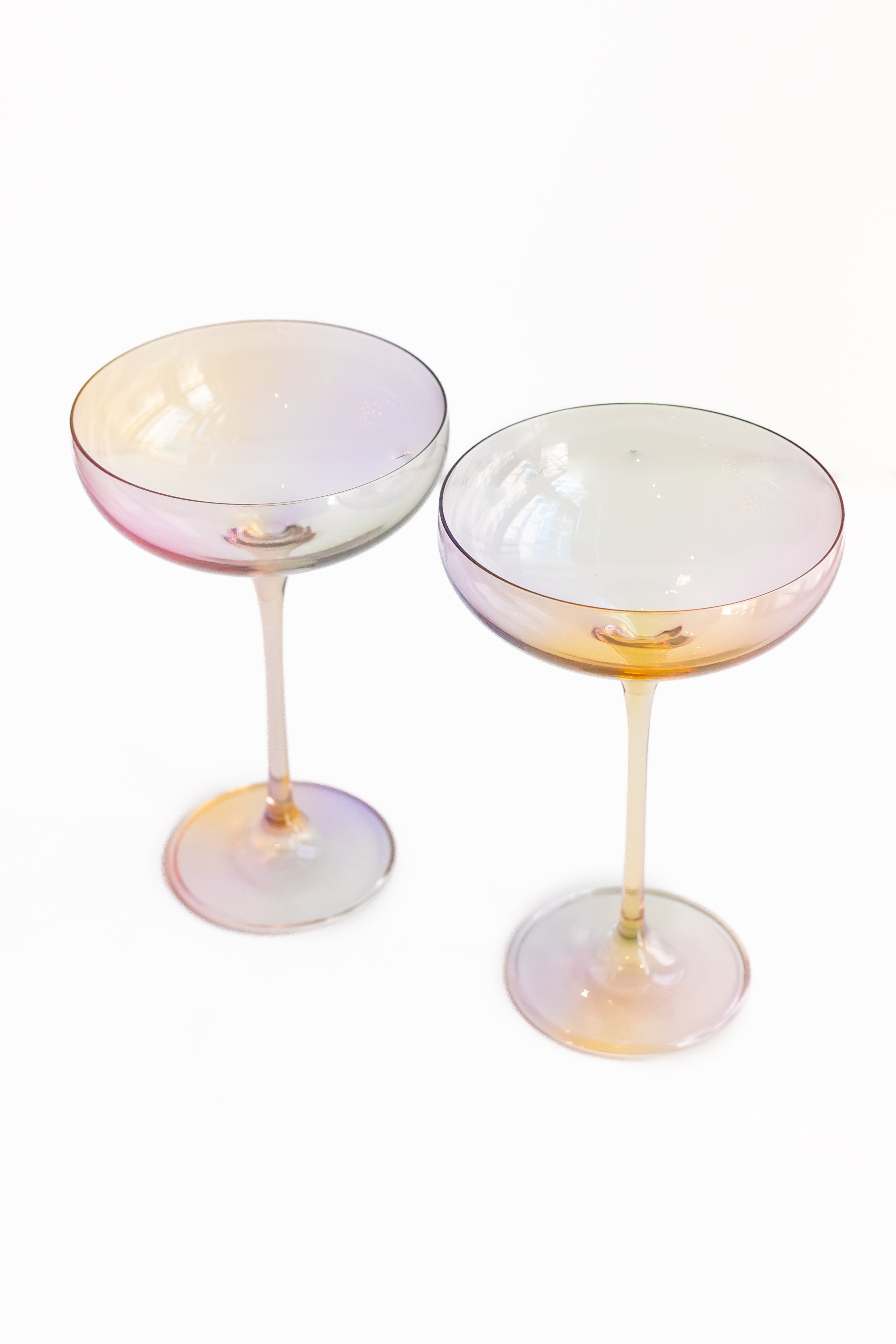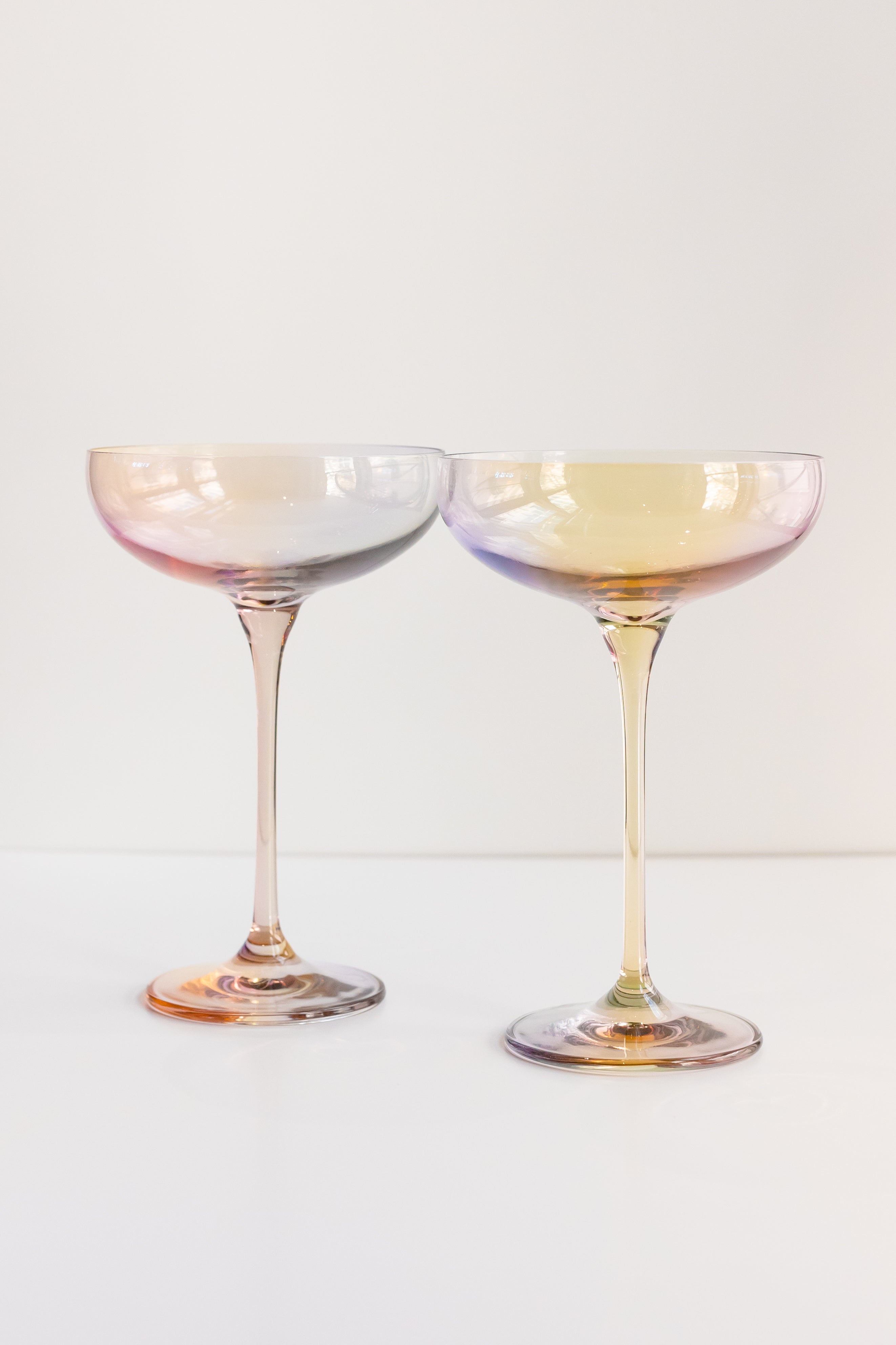 This set includes two champagne coupe glasses crafted from high – quality transparent glass, likely by hand – blowing. They showcase an iridescent gradient color effect that shifts from warm to cool tones, with hues like soft pinks, purples, and warm golds/yellows. The glasses have a classic design with a wide, shallow bowl, a tall tapered stem, and a wide flat base, perfect for celebratory drinks.
