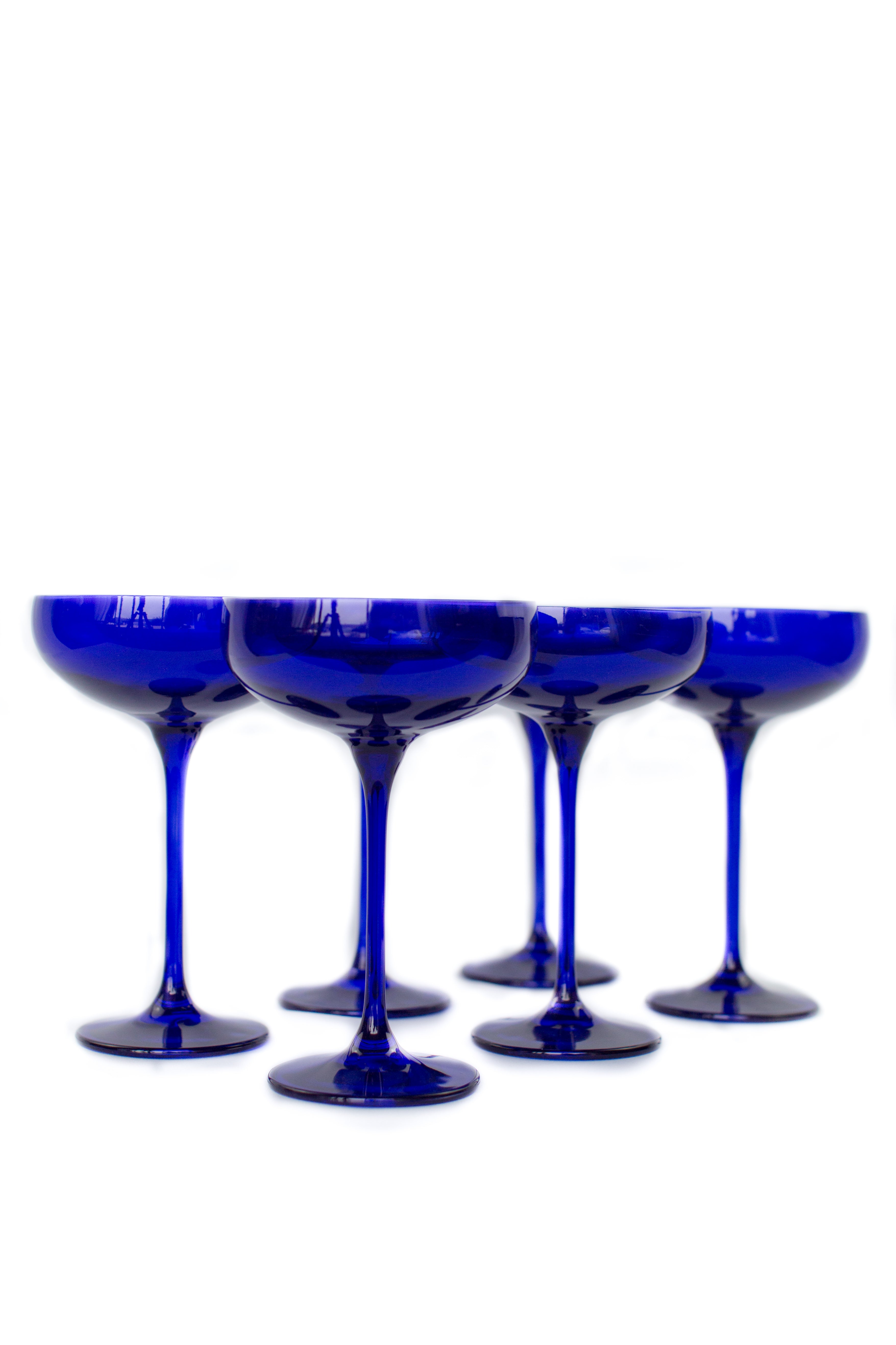 This set of six champagne coupe glasses is a remarkable addition to any table. Skillfully crafted by glass artisans, they showcase a vibrant deep cobalt – blue color and a sleek, minimalist design. The tall, slender stem connects a wide, shallow bowl to a flat base, making them ideal for serving champagne or cocktails.