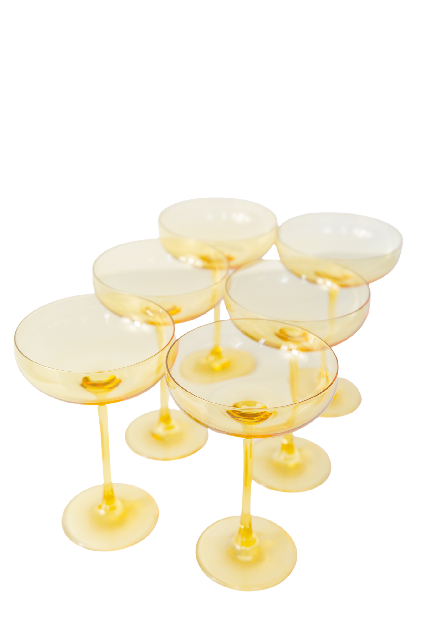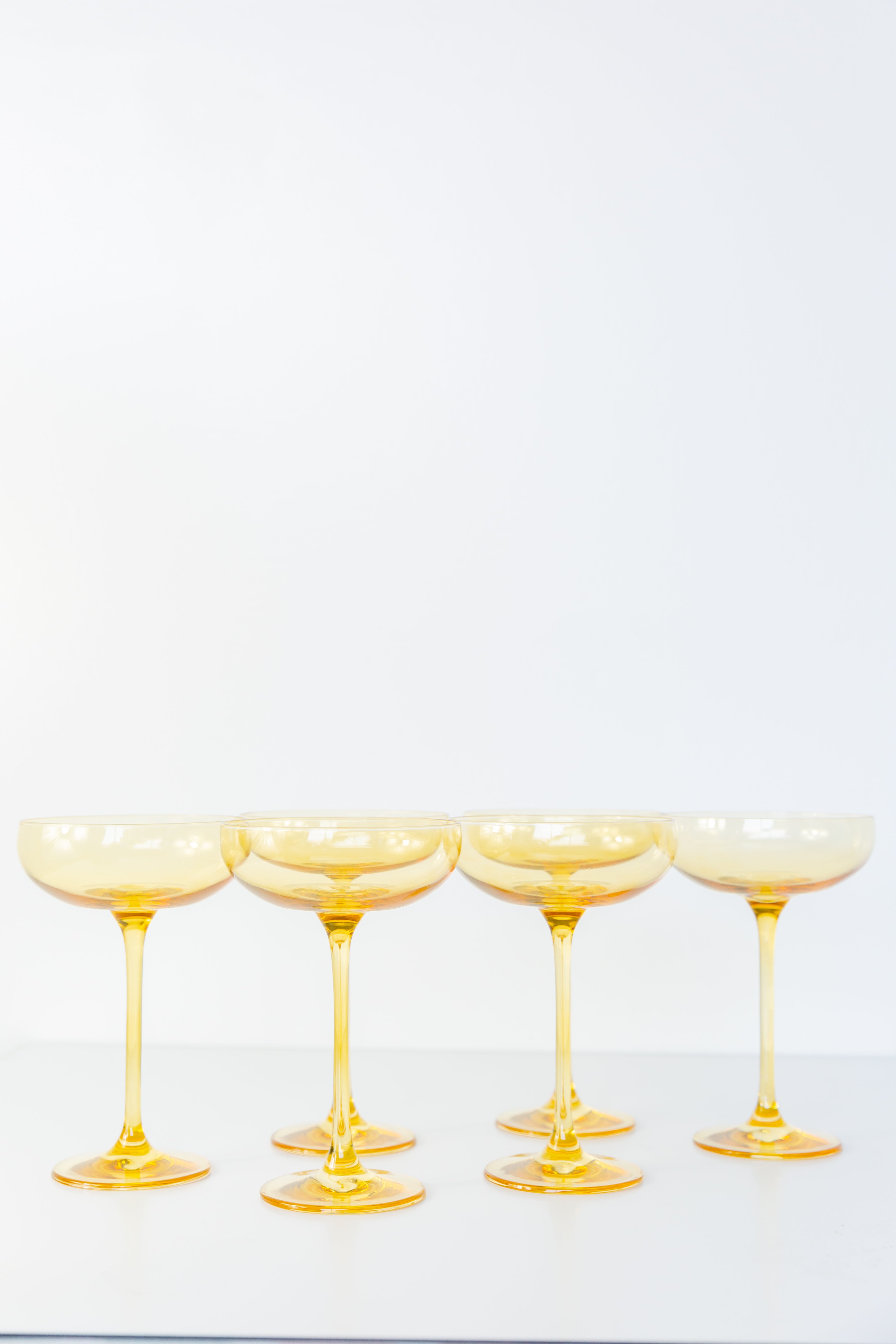 This set includes six elegant champagne coupe glasses. Crafted by glass artisans, they have a warm, golden – yellow (amber) tint. The classic coupe design features a wide, shallow bowl, a long and slender stem, and a round, flat base, adding sophistication to any drink – serving collection.