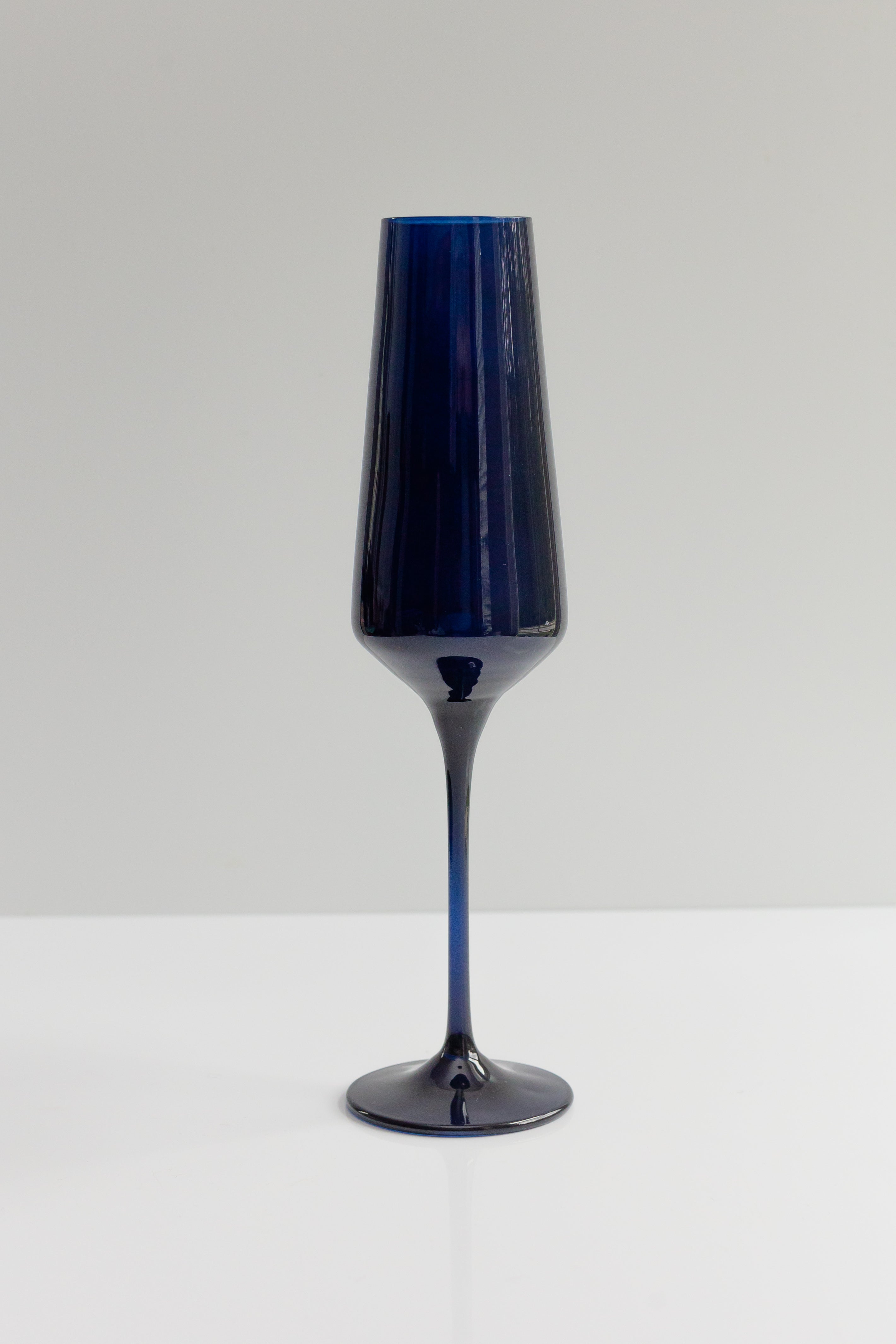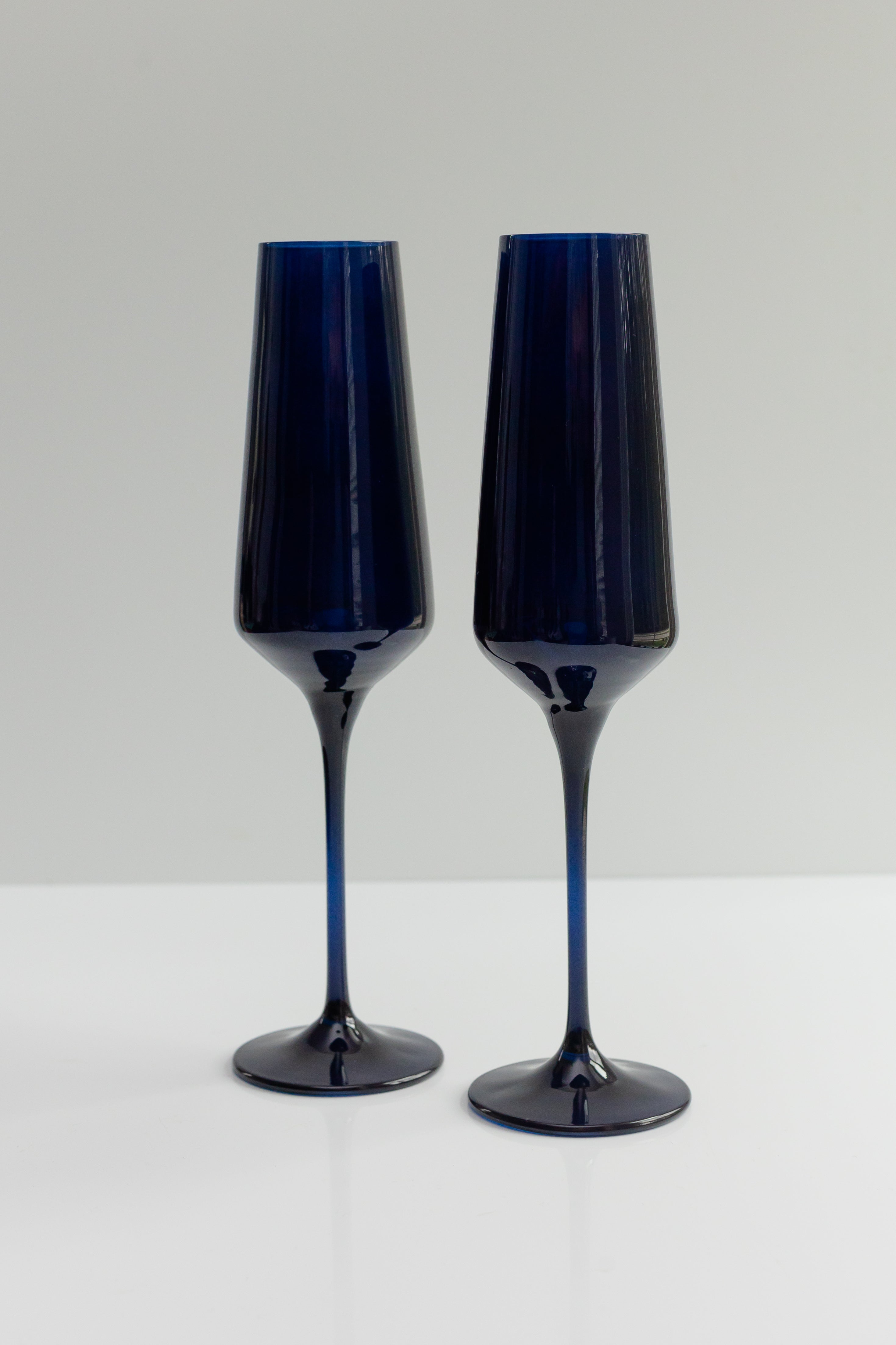 This set of two champagne flutes is a beautiful addition to any table setting. Hand – blown by skilled artisans, they are crafted from glass with a rich, deep blue tint. The minimalist and modern design features a tapered bowl, a thin stem, and a wide, flat circular base with a hanging hole, offering a perfect blend of style and practicality.