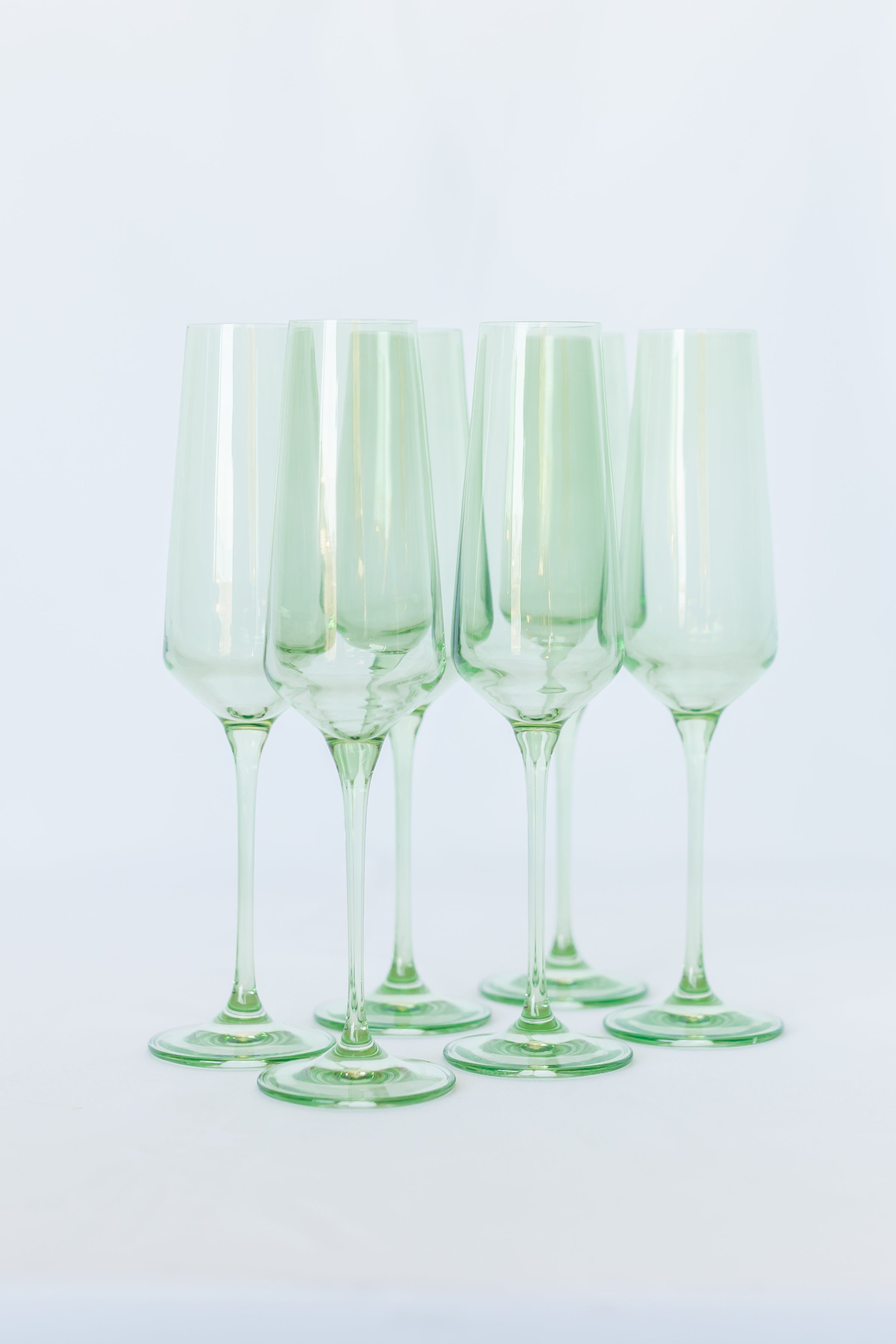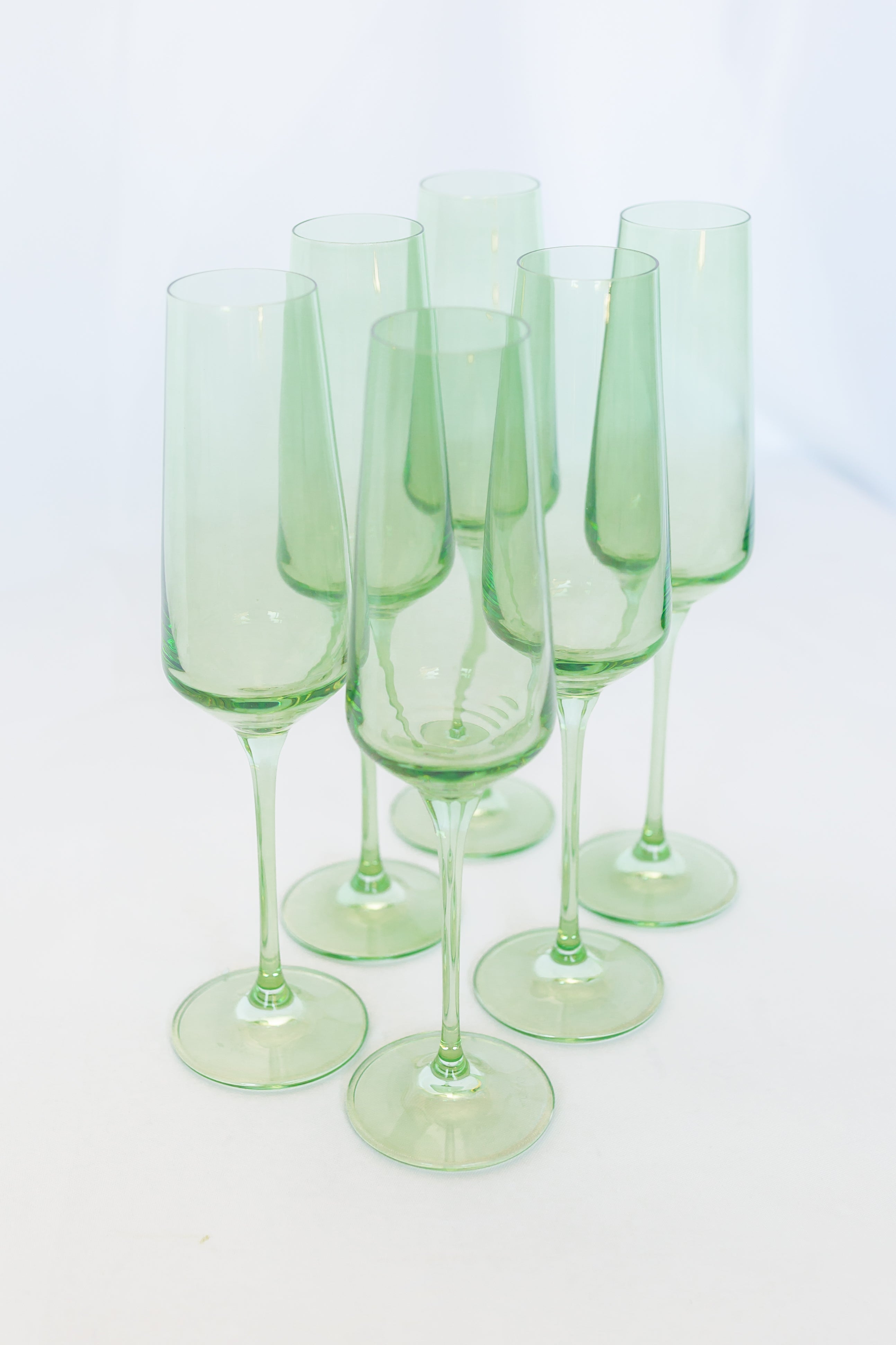 This is a set of six elegant champagne flutes crafted from hand – blown colored glass. They feature a soft, light green tint that gives them a sophisticated look. With a minimalist design, the tall, tapered bowl, slender stem, and wide base make them perfect for serving sparkling beverages.