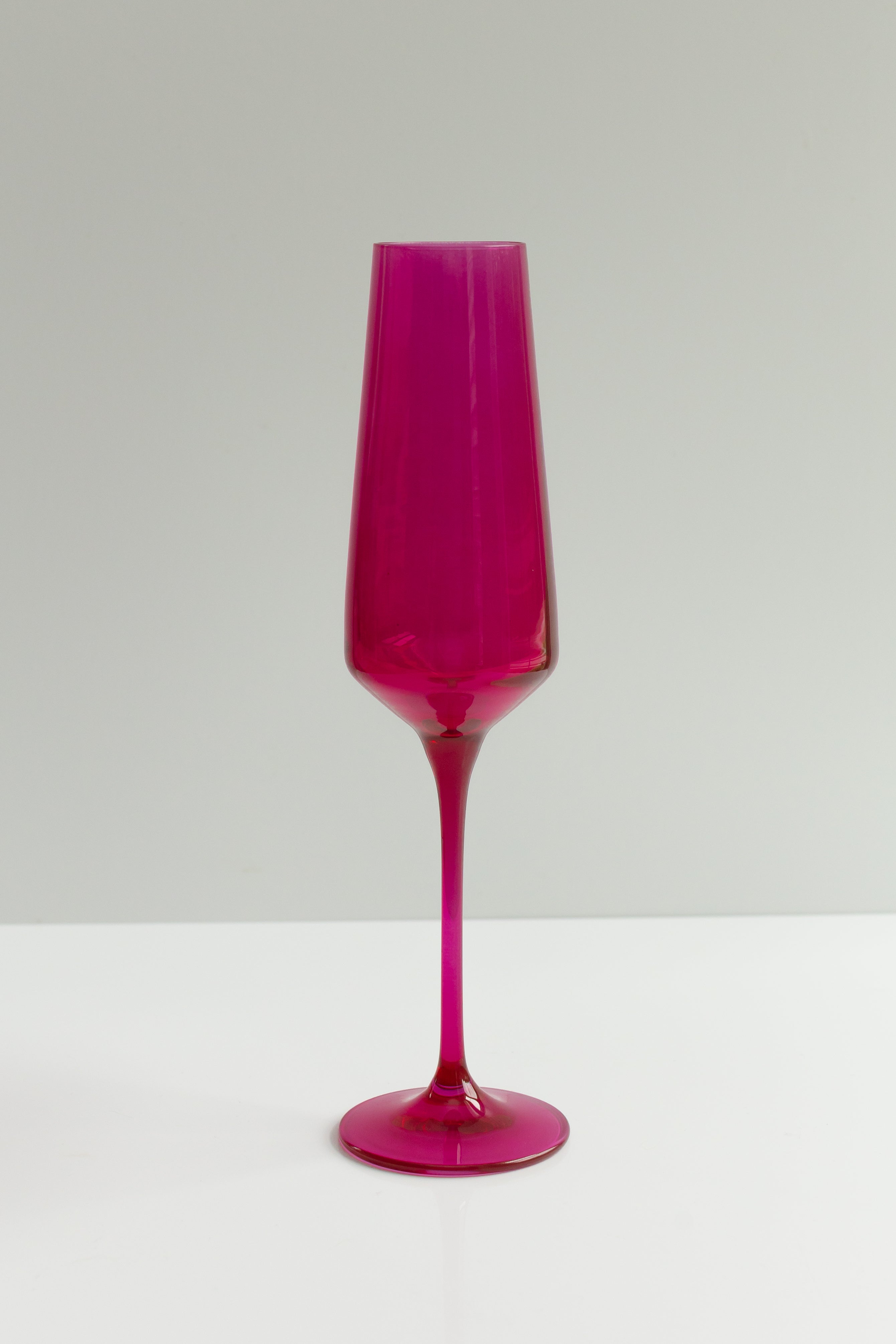 This product is a set of six champagne flutes crafted from hand – blown colored glass by Polish artisans. The glasses feature a sleek, tapered design with a vivid, uniform magenta color. They have a long stem, a narrow bowl to preserve bubbles, and a wide base for stability, making them both practical and aesthetically pleasing.