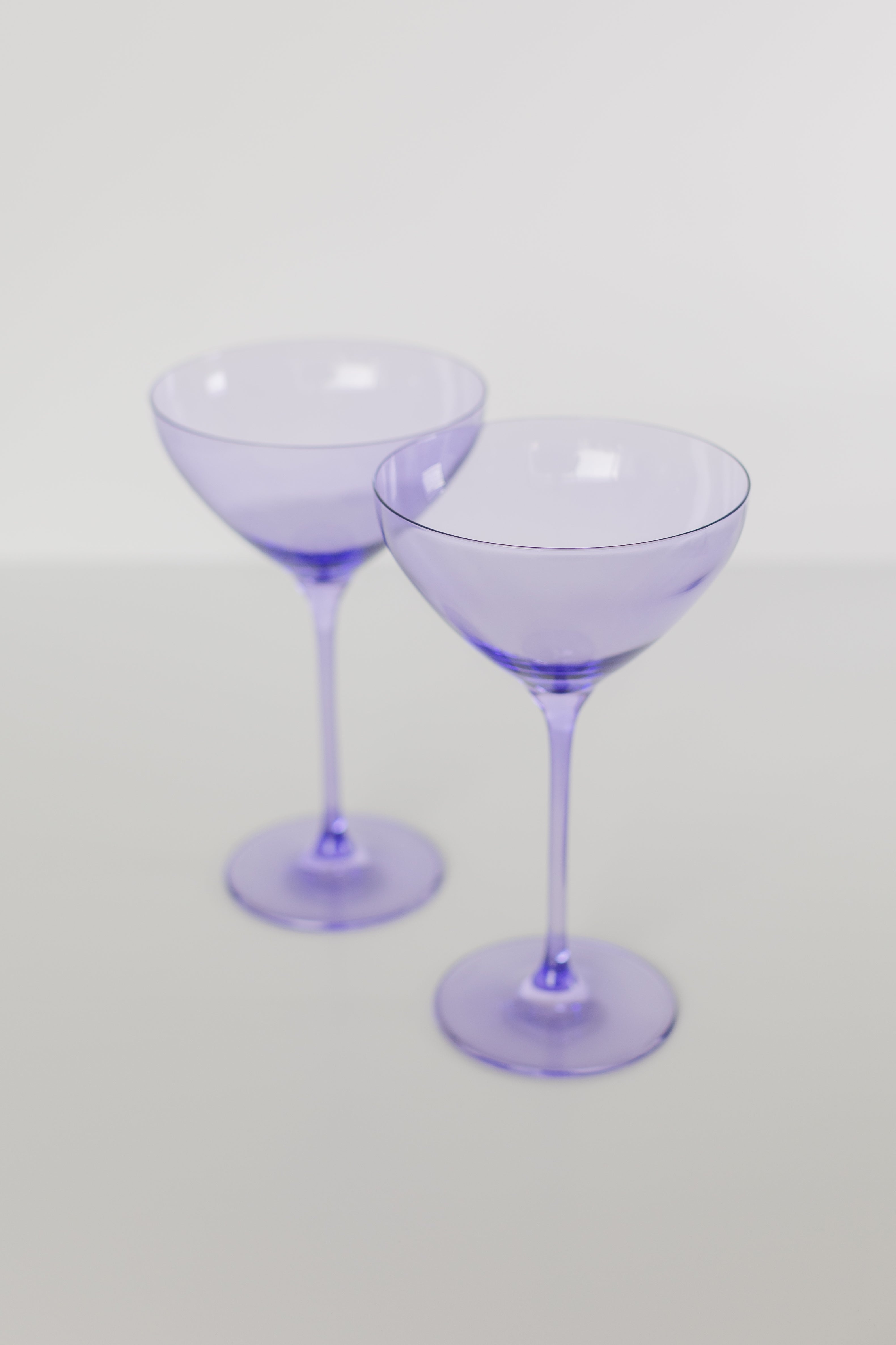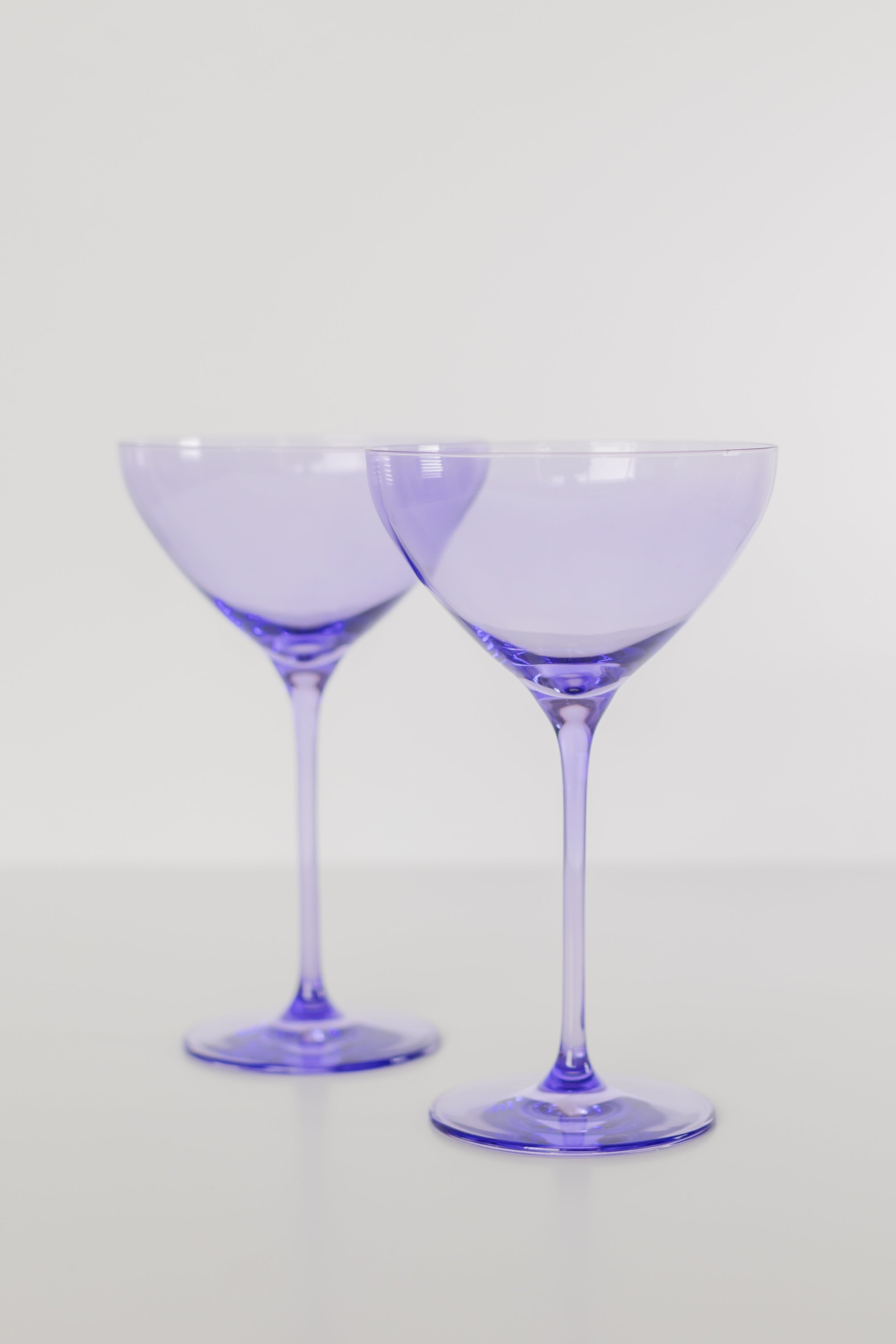 This set of two stemmed cocktail glasses is a perfect addition to any home bar. With a wide, shallow bowl and a slender stem, it is designed in a minimalist and elegant style. The glasses are made of colored glass with a soft, pale lavender/purple hue, adding a touch of sophistication to your drink presentation.
