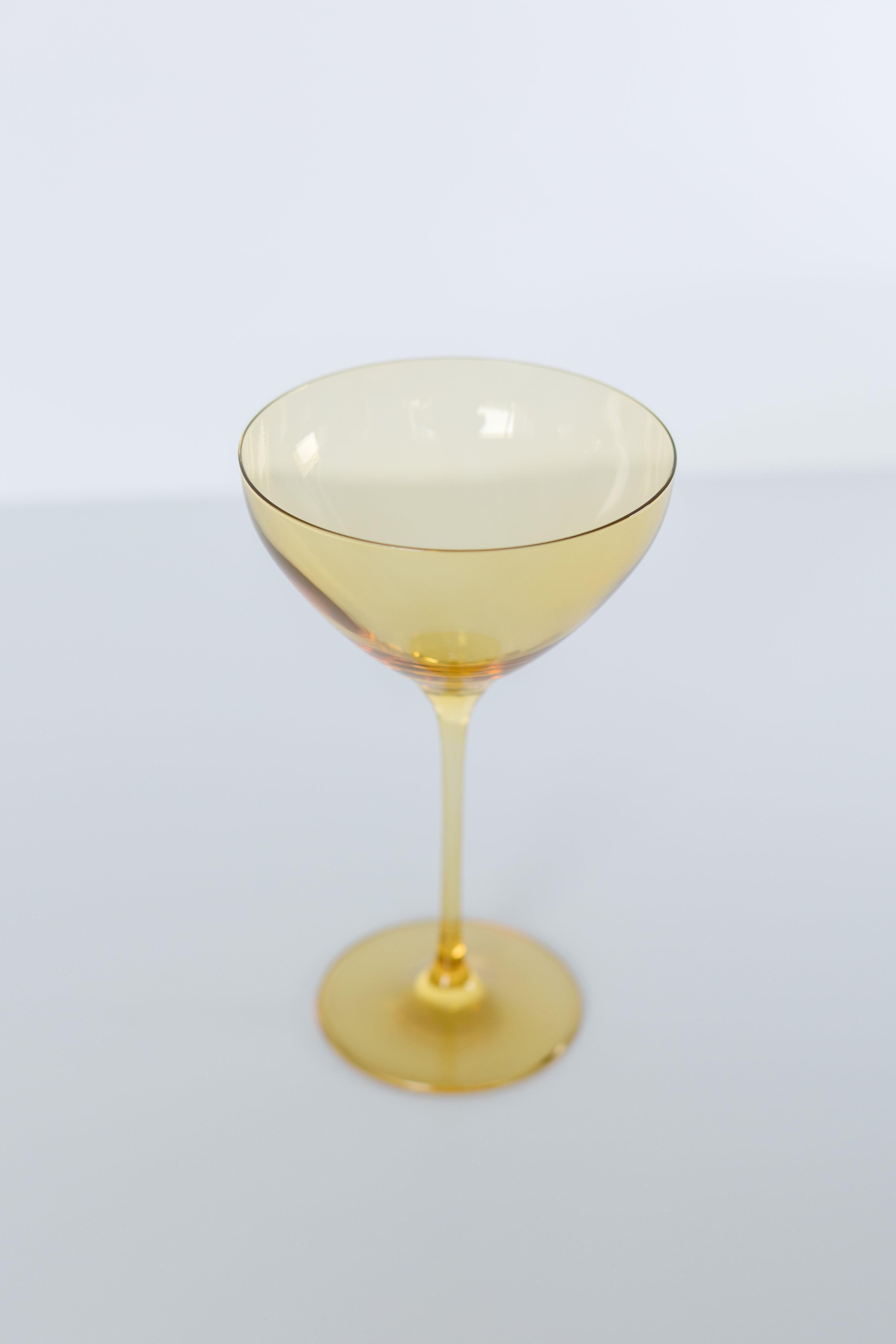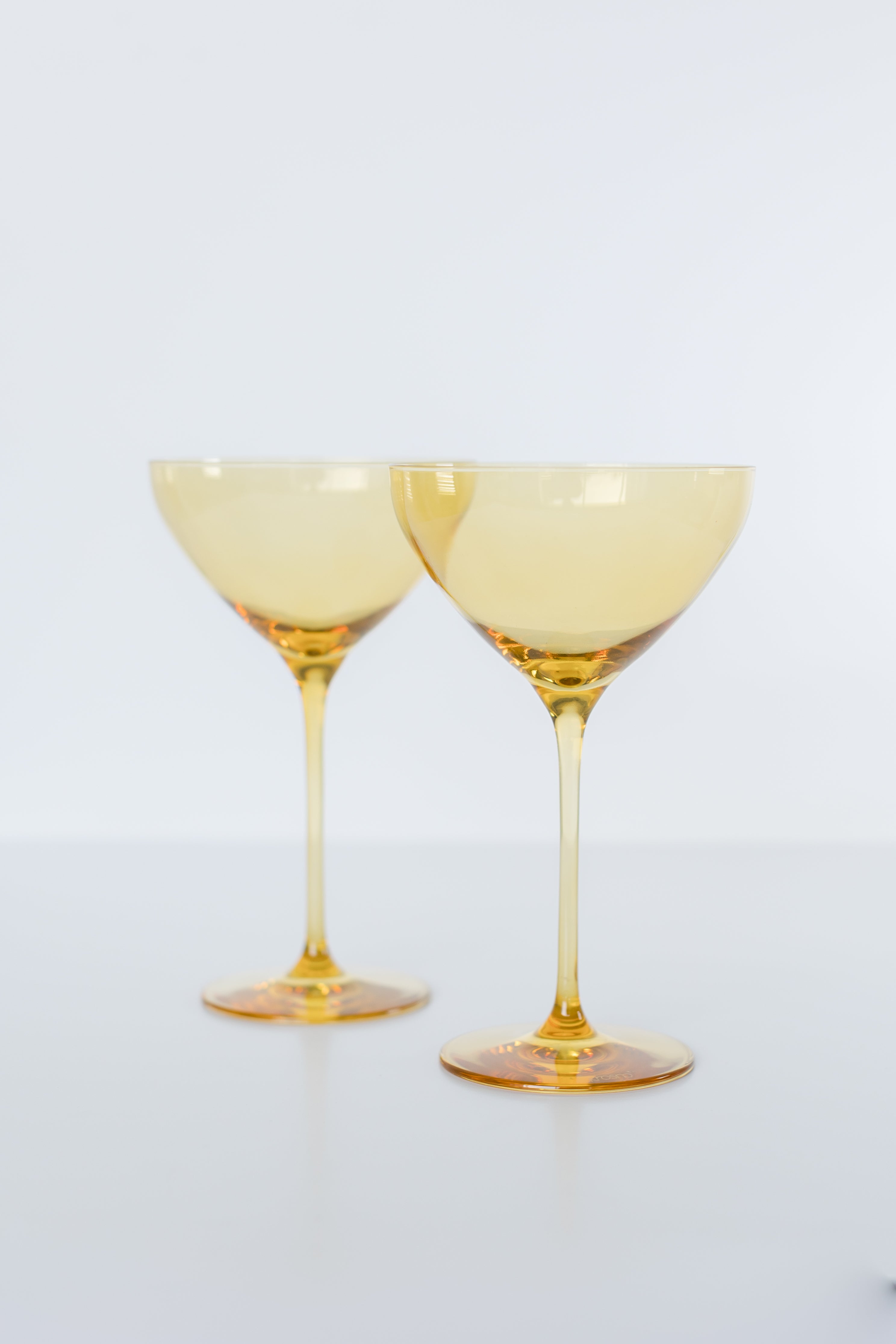 This set of two stemmed martini coupe glasses is a must – have for cocktail enthusiasts. Crafted by skilled glass artisans, they feature a beautiful pale amber/yellow tint with a gradient effect. The classic coupe shape, with a wide, shallow bowl and a slender stem, is both elegant and functional, suitable for various settings.