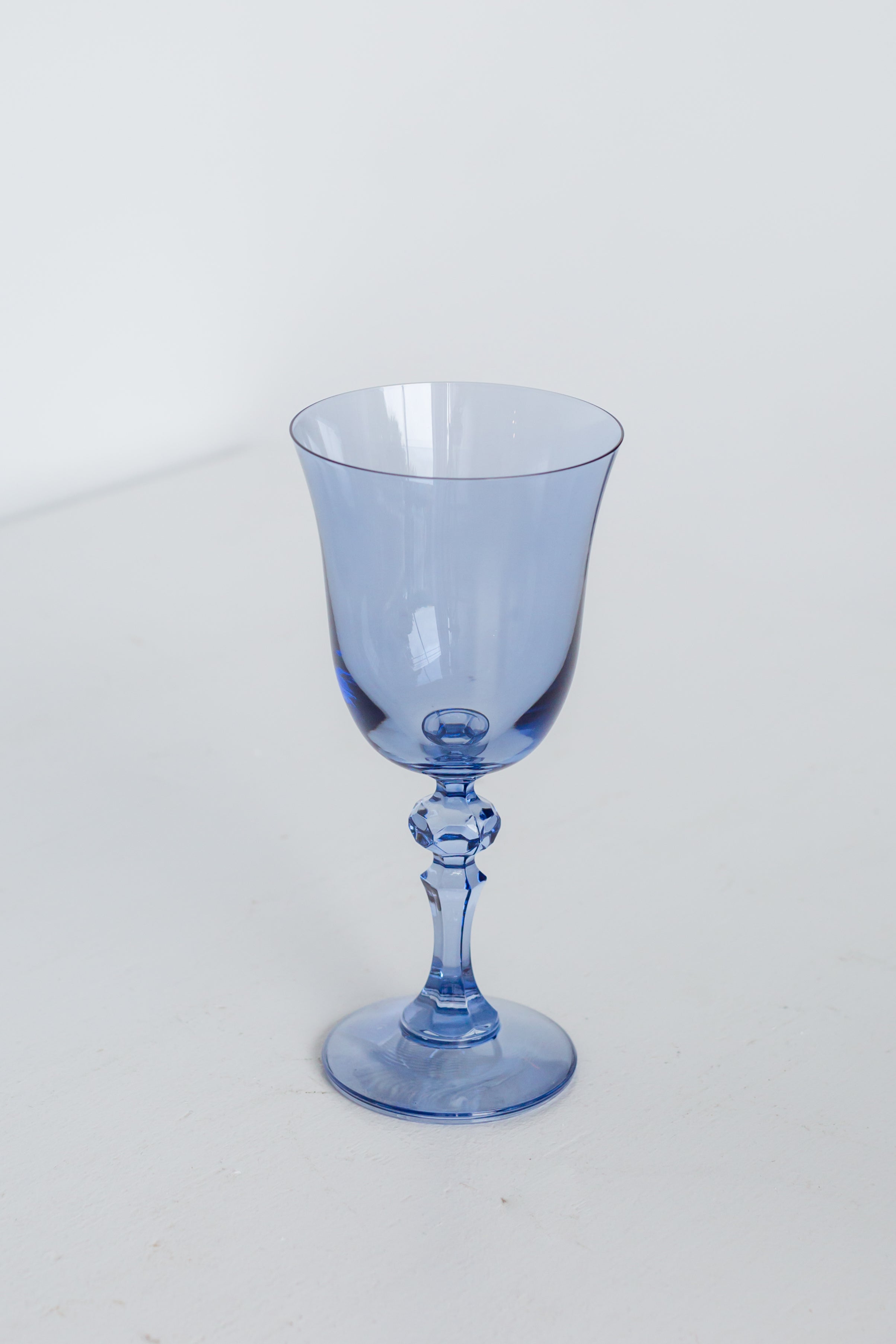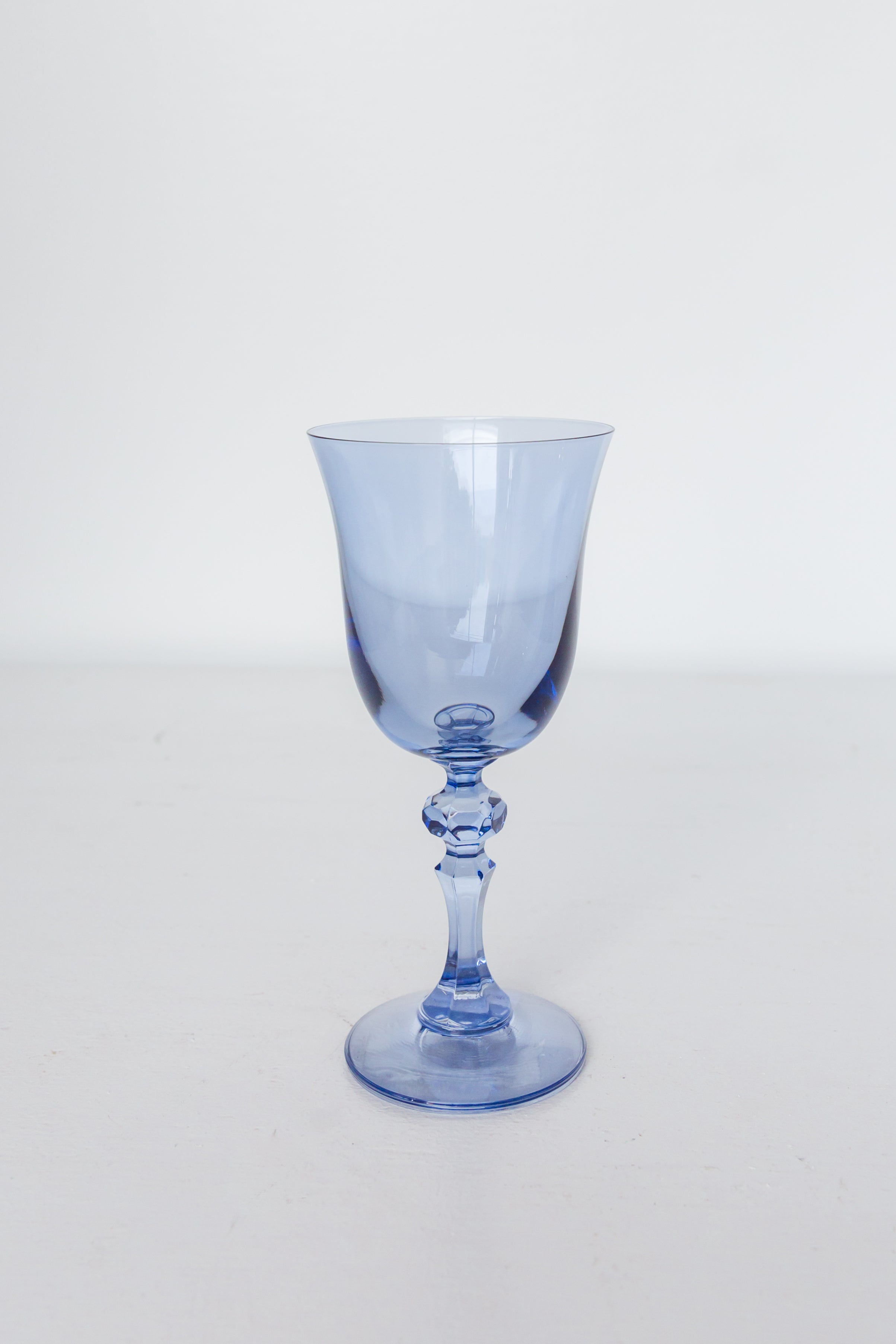 This set of two wine goblets is a wonderful addition to any table. Crafted from light blue, translucent colored glass, they have a classic wine glass design with a flared bowl, a decorative faceted stem, and a stable footed base. They are elegant and suitable for various occasions.