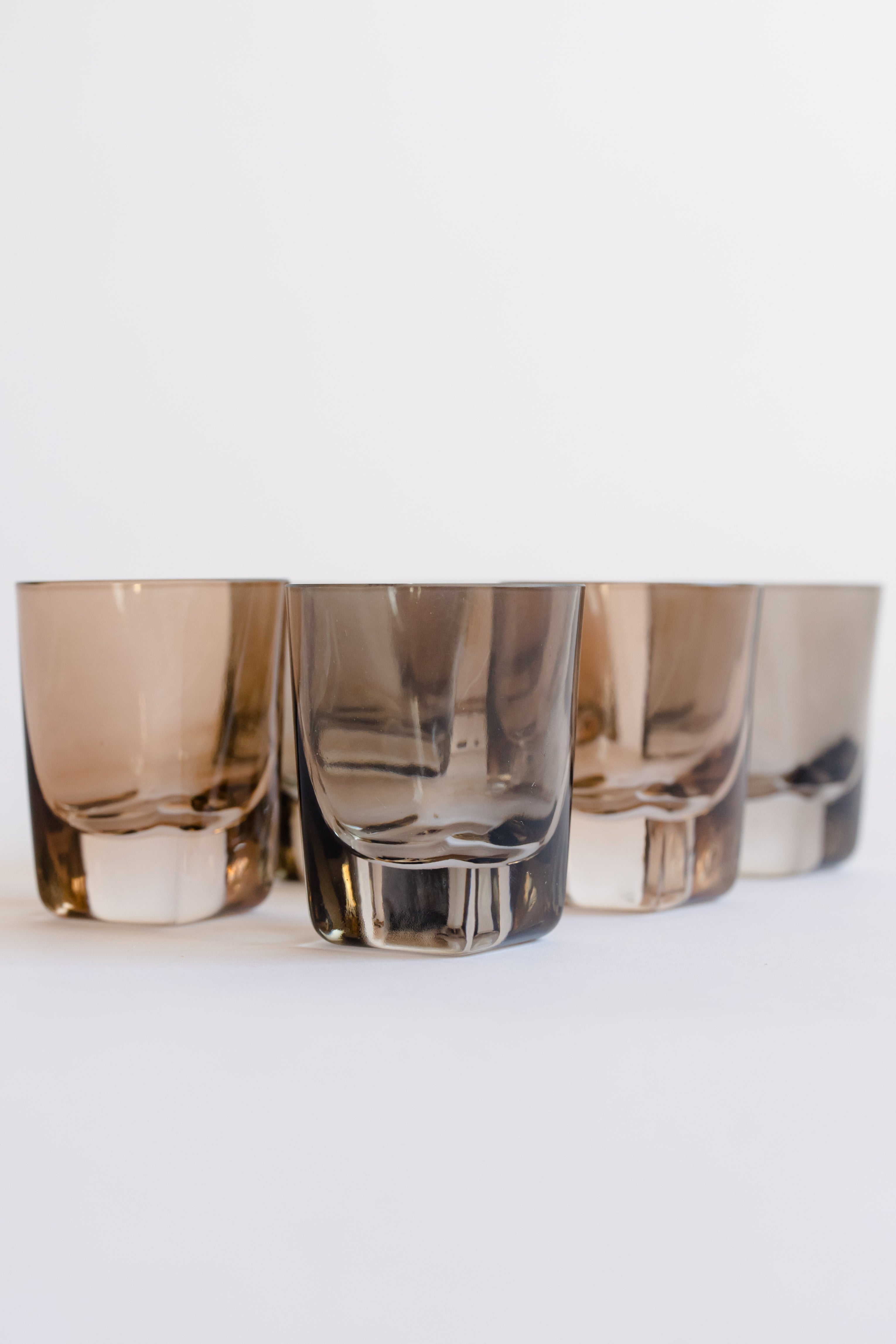 These shot glasses offer a contemporary and minimalist take on drinkware. Hand – blown by skilled artisans, they come in a set of six. Each glass has a smoky color gradient from light amber to deep gray – brown, and features a simple design with a flared rim and a thick, faceted base.