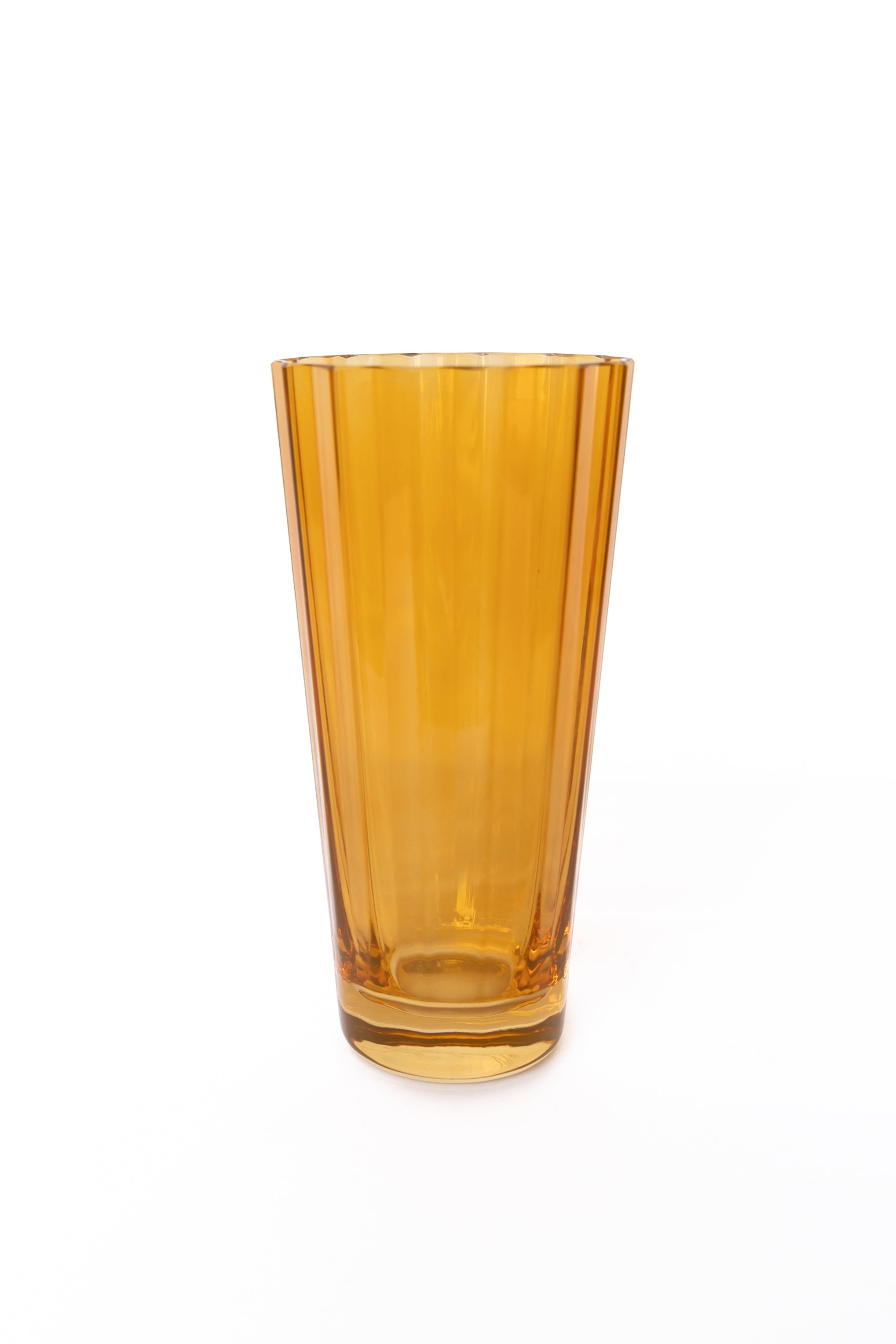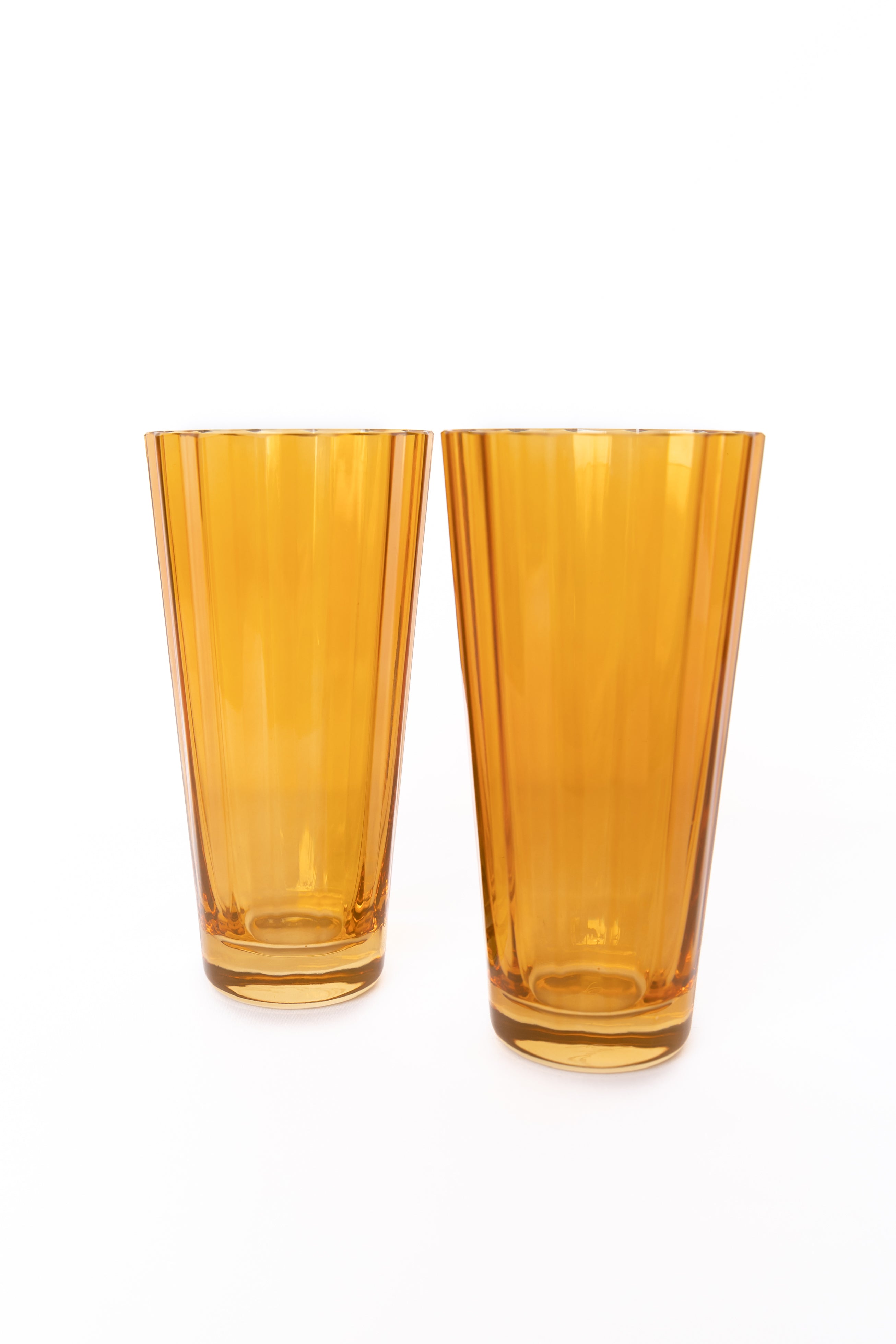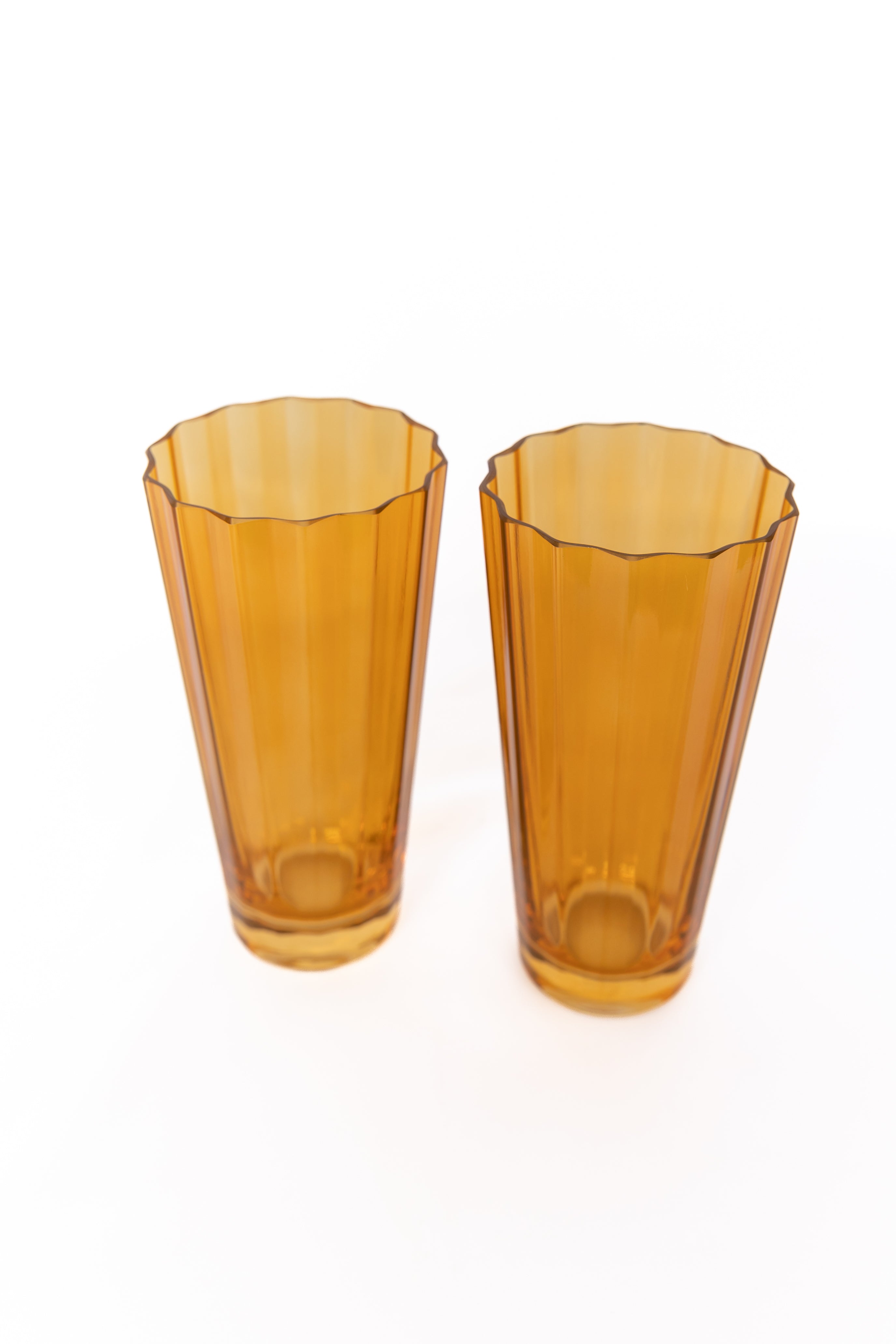 This set consists of two decorative vases made from amber – tinted glass. They have a slender, tapered shape with vertical fluting that runs from the base to the rim, creating an elegant texture. The scalloped top rim adds a delicate and decorative touch, making these vases a high – quality addition to any decor.