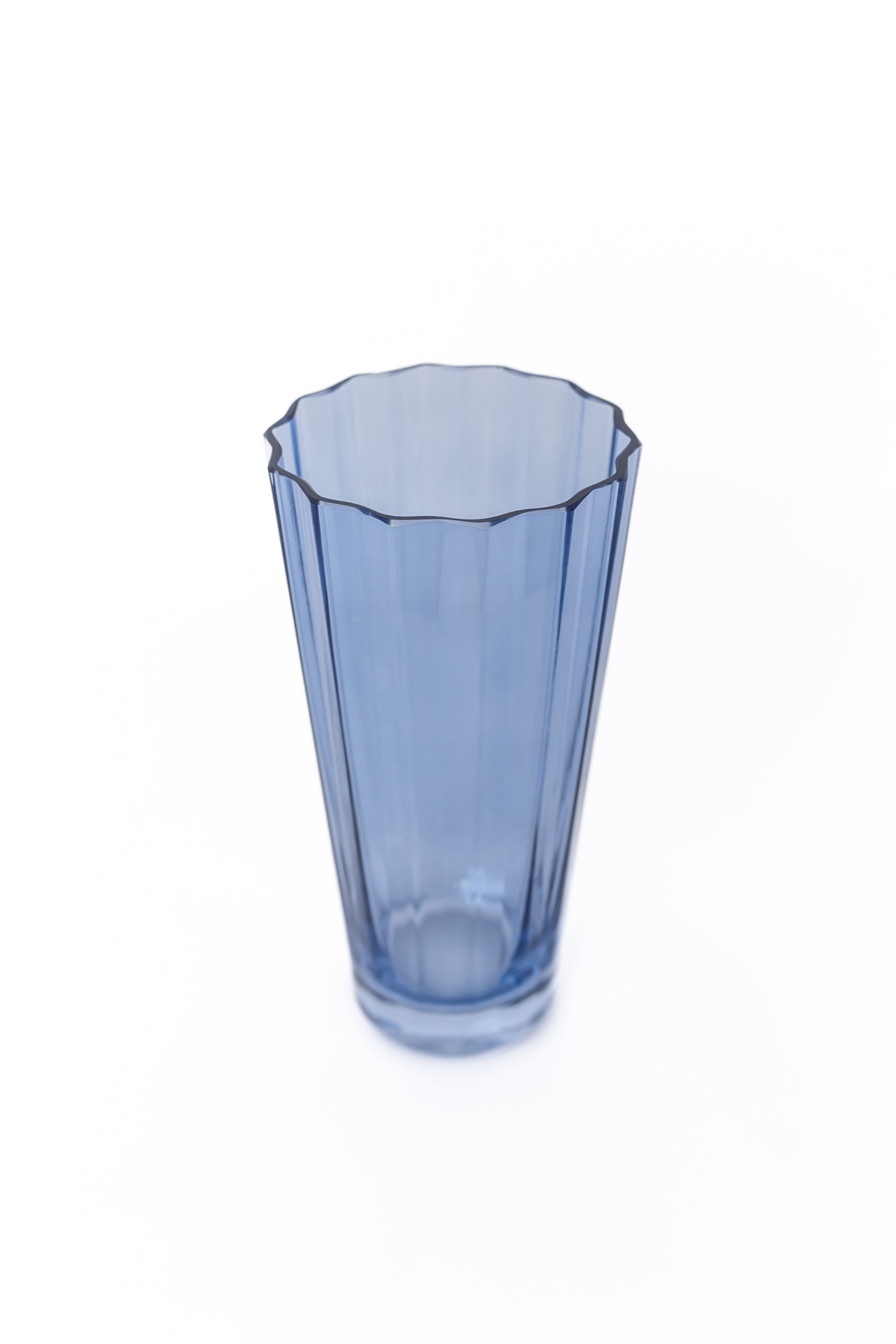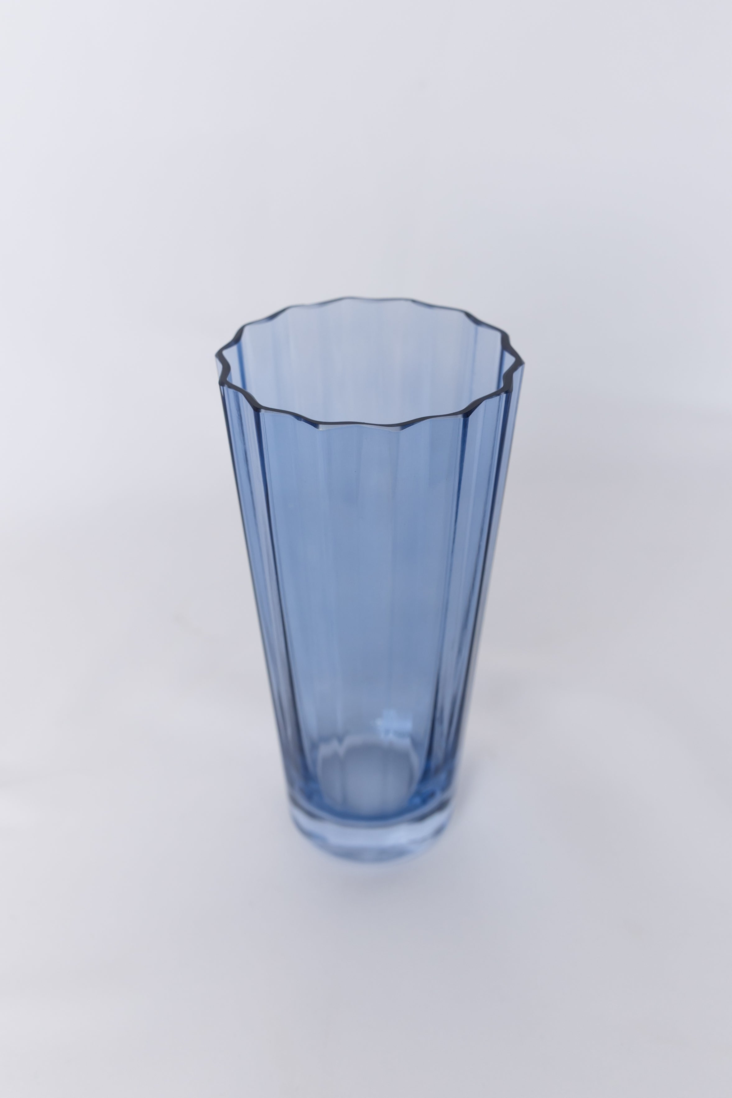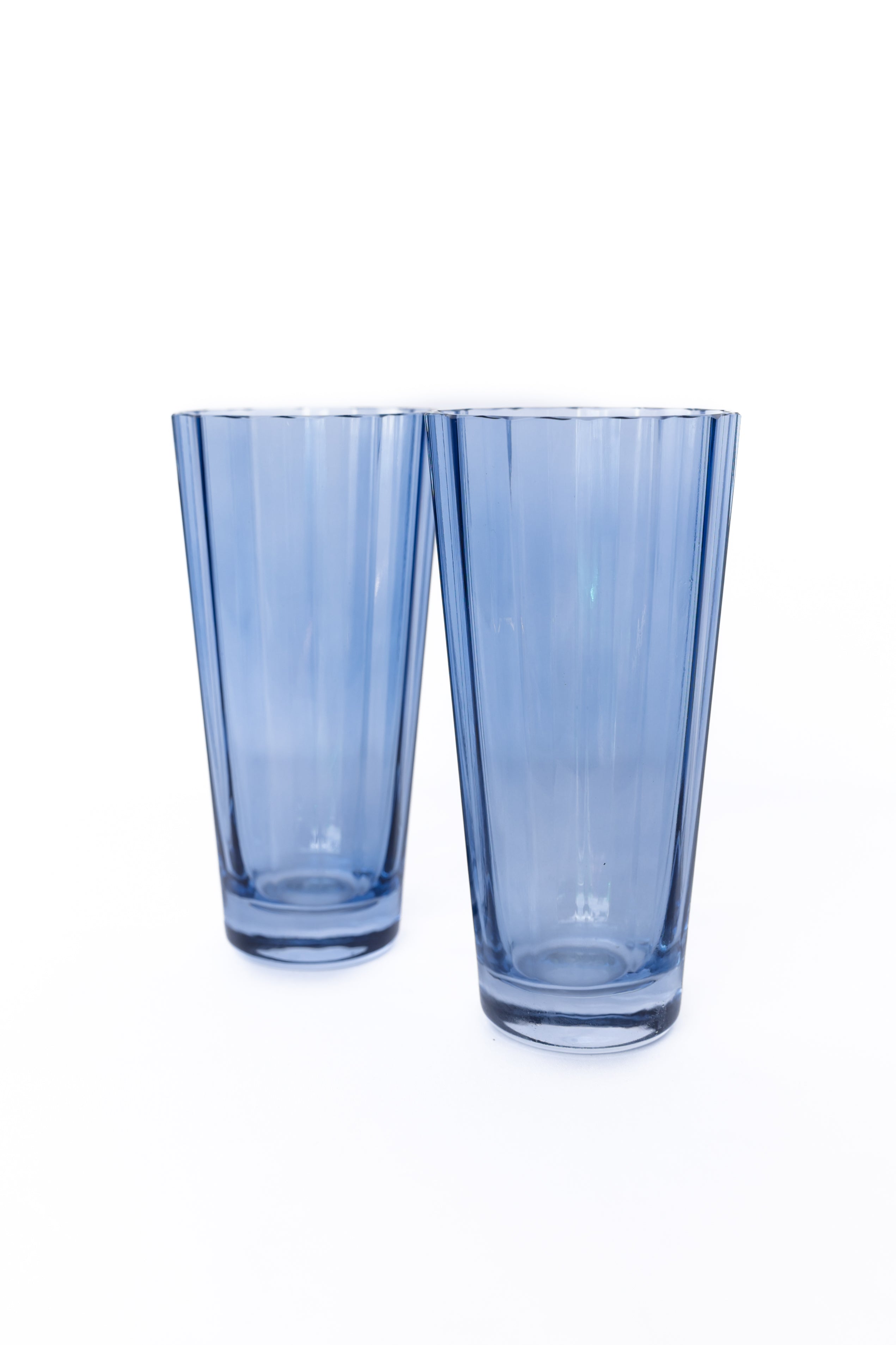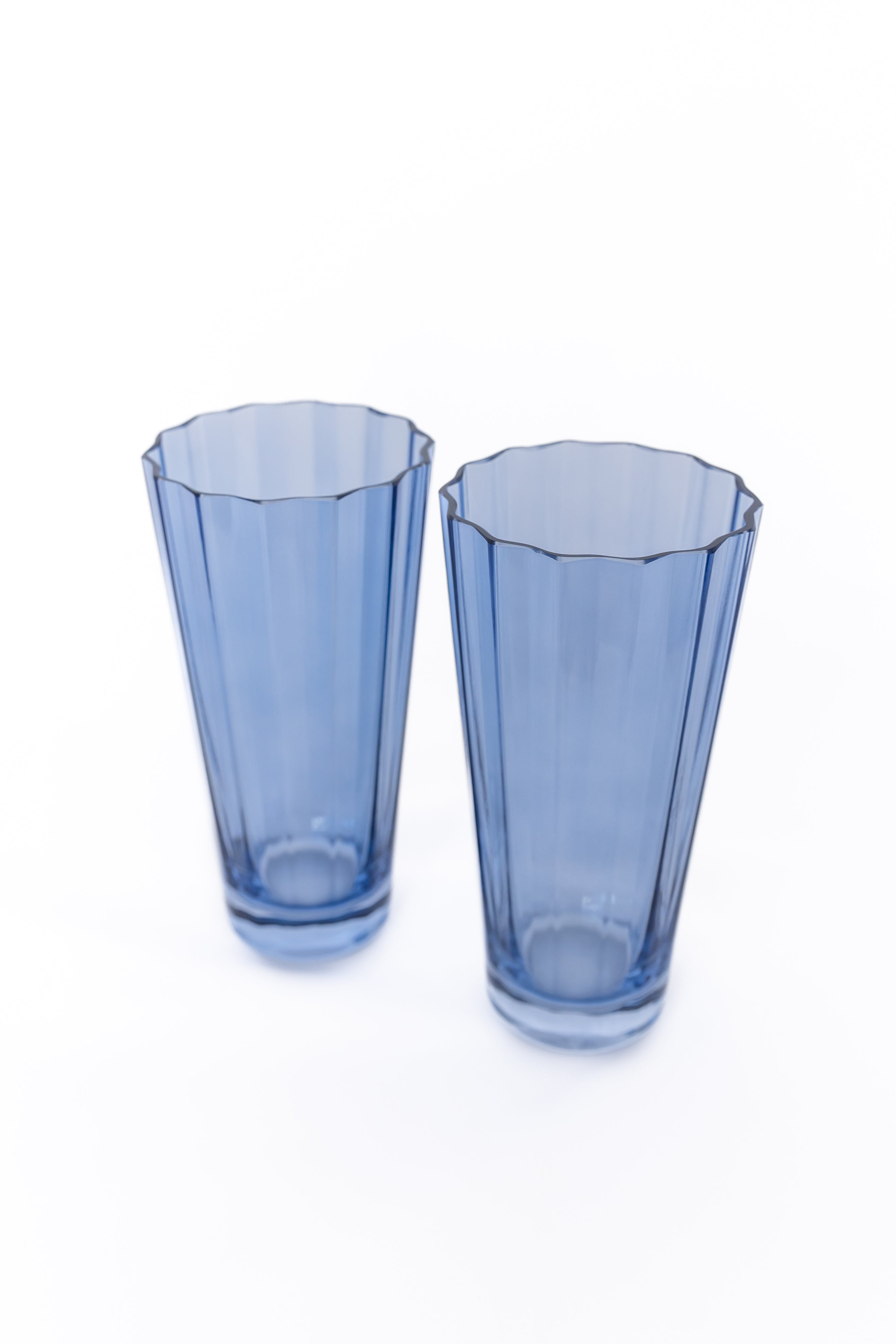 This set includes two tall, slender drinking glasses with a lovely translucent blue tint. They feature vertical ribbed patterns that create a faceted effect, adding both texture and visual interest. One of the glasses has a scalloped top edge, which gives it a decorative and unique look. These glasses can be used for beverages or as vases.
