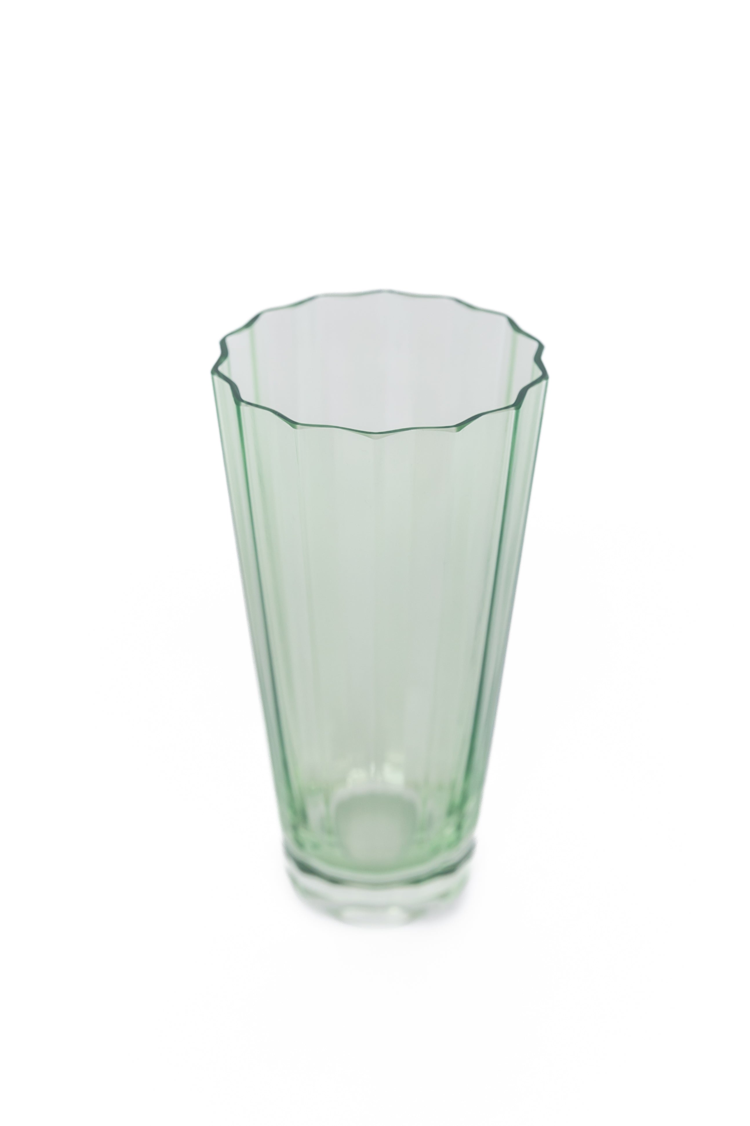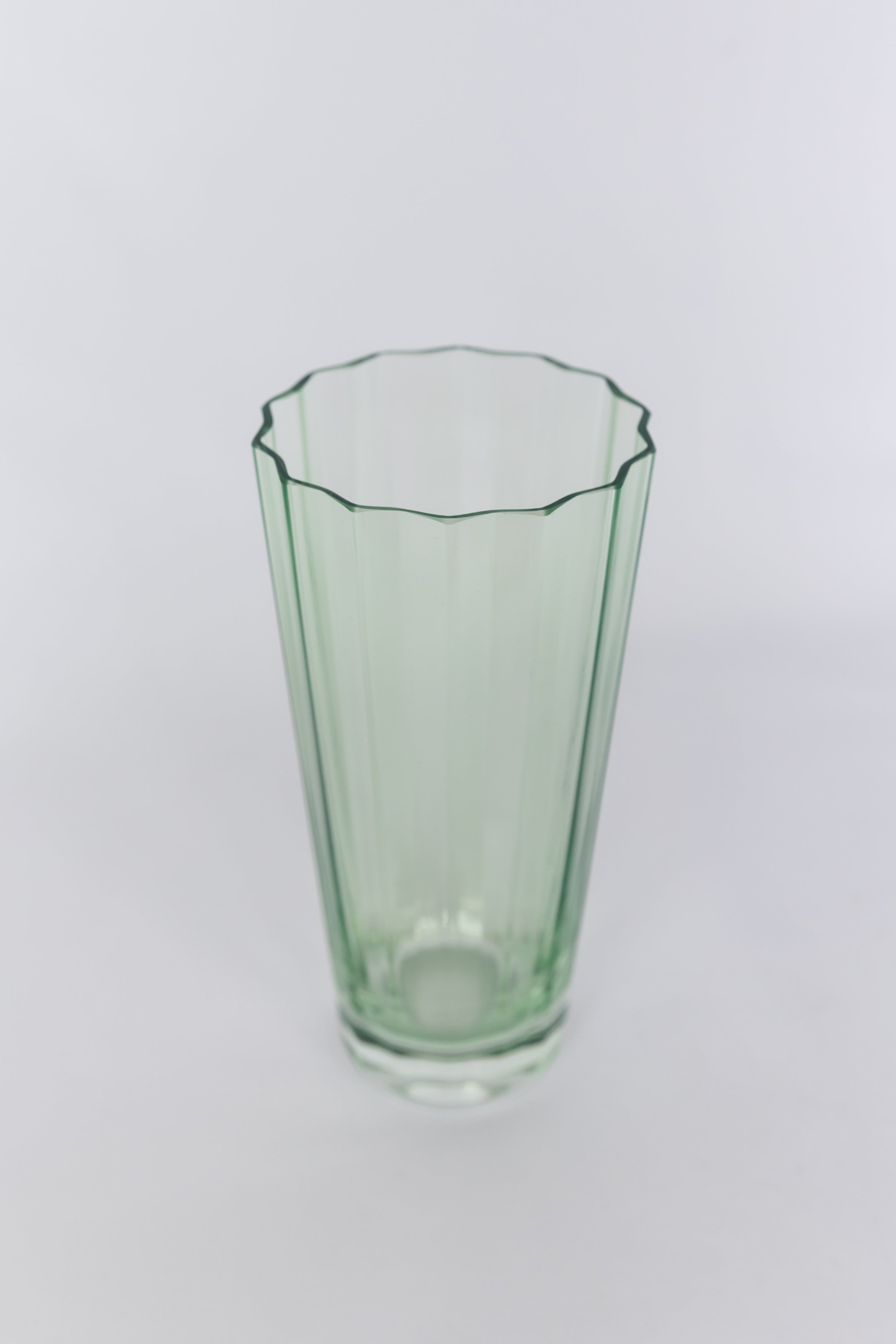 This product is a set of two tall glass vessels. They are crafted from transparent glass with a gentle green tint, offering a unique visual appeal. The vessels feature a scalloped rim and vertical flutes, making them suitable for use as both elegant drinking glasses and decorative vases.