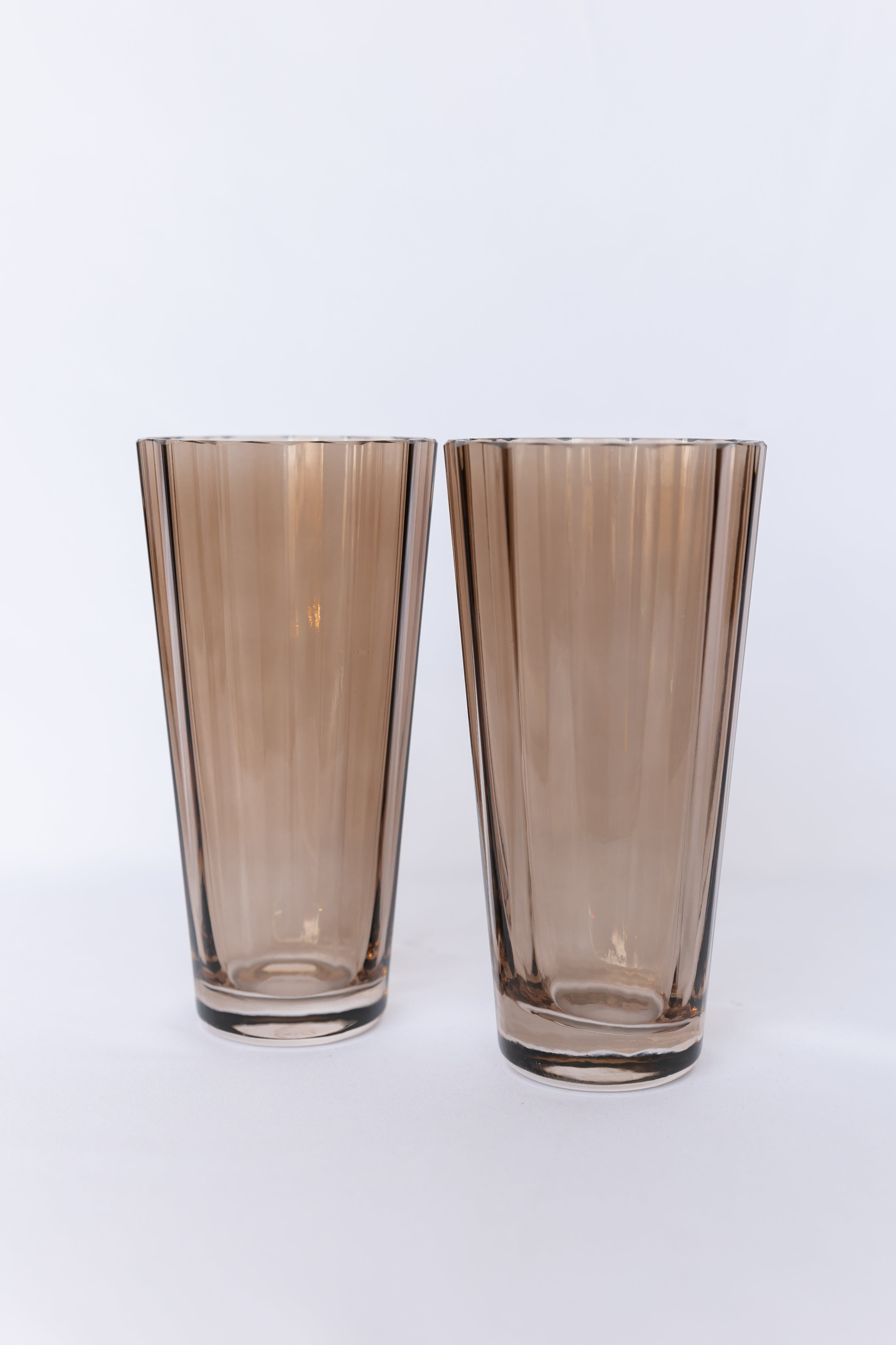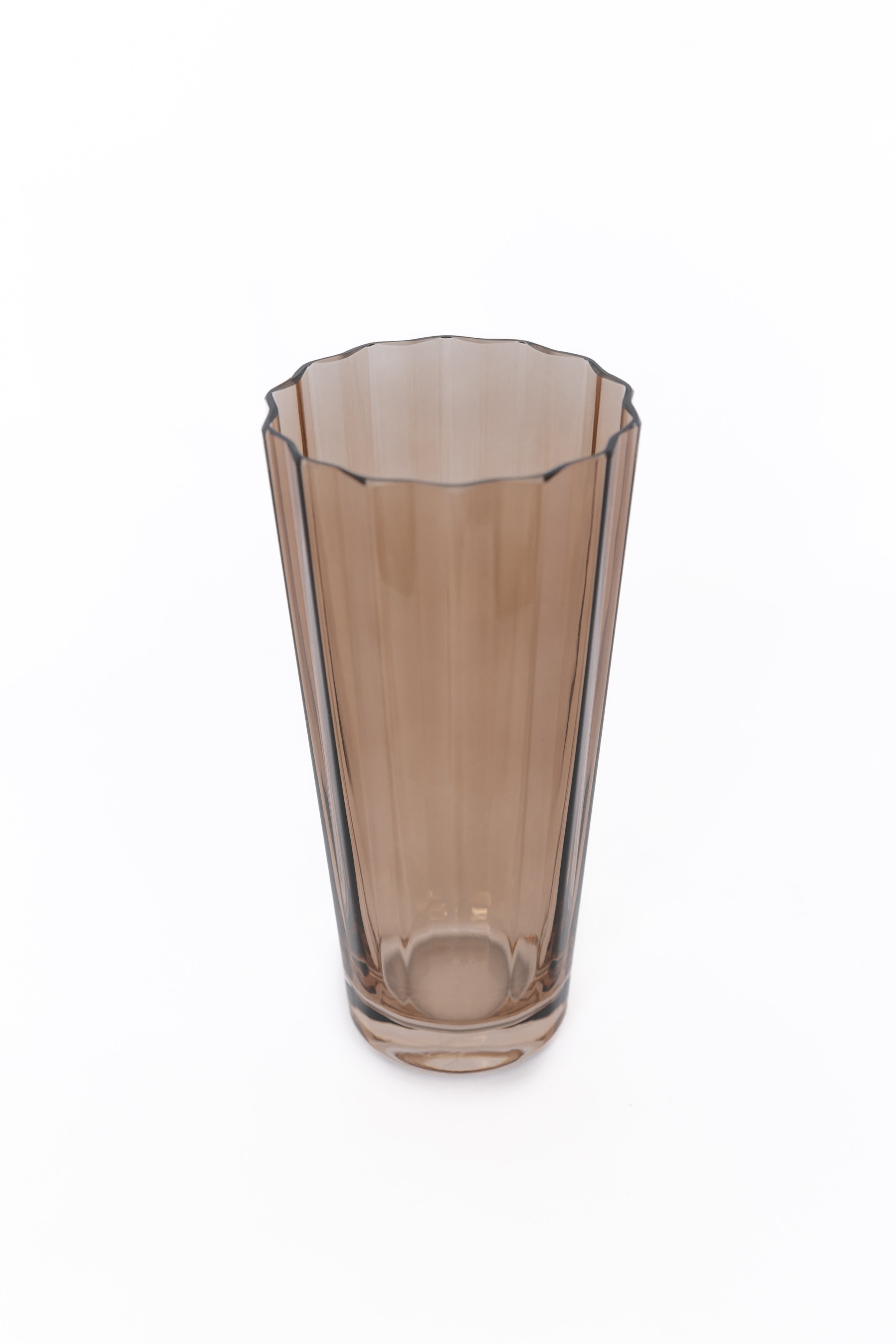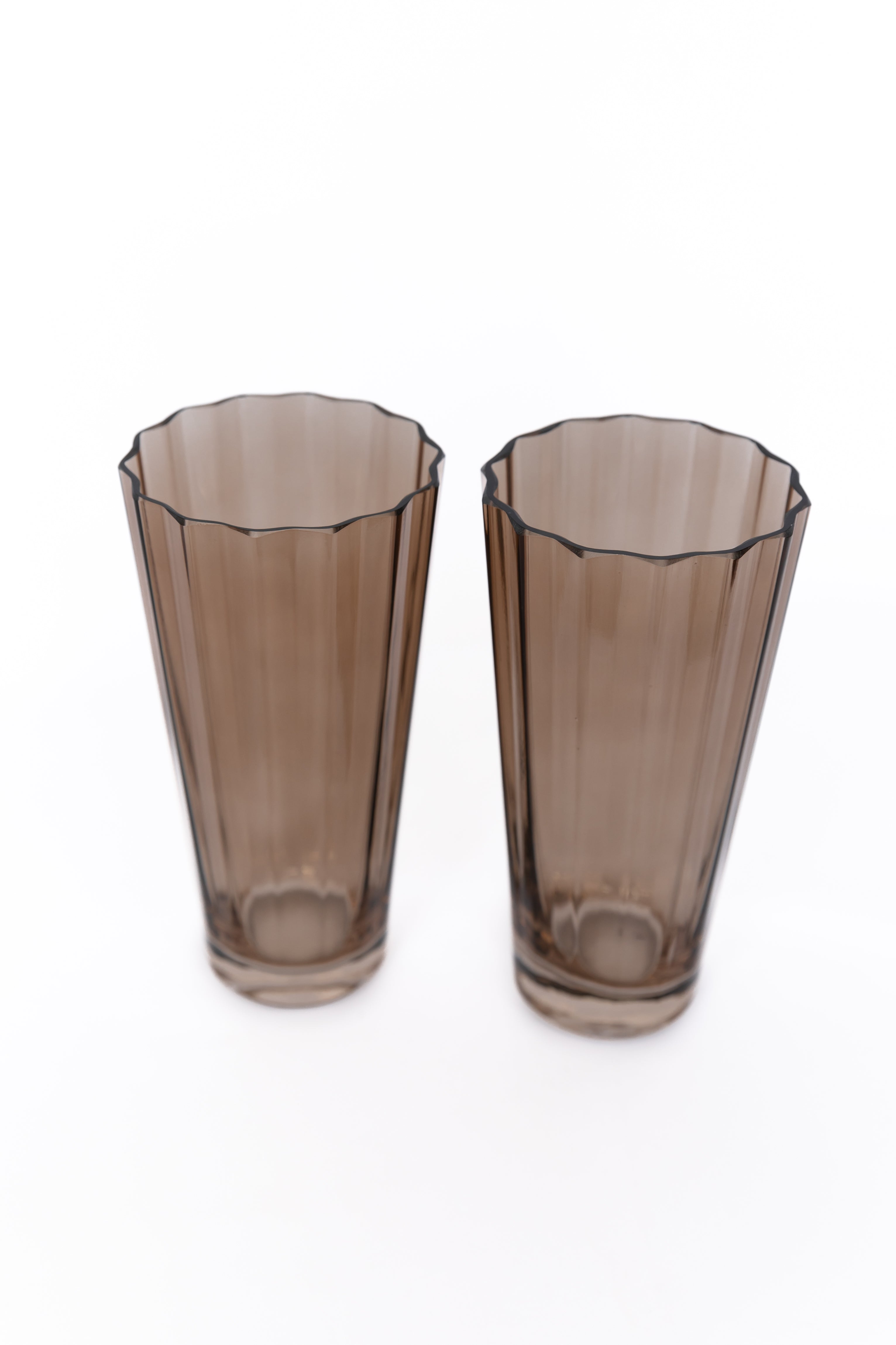 This set of two decorative glass vases is a captivating addition to any space. Crafted from smoked or amber – tinted glass with a warm, muted brown color, they have a tall, slender silhouette. The vertical flutes and scalloped rim add an elegant and sophisticated touch, making them ideal for floral arrangements or as standalone decor.