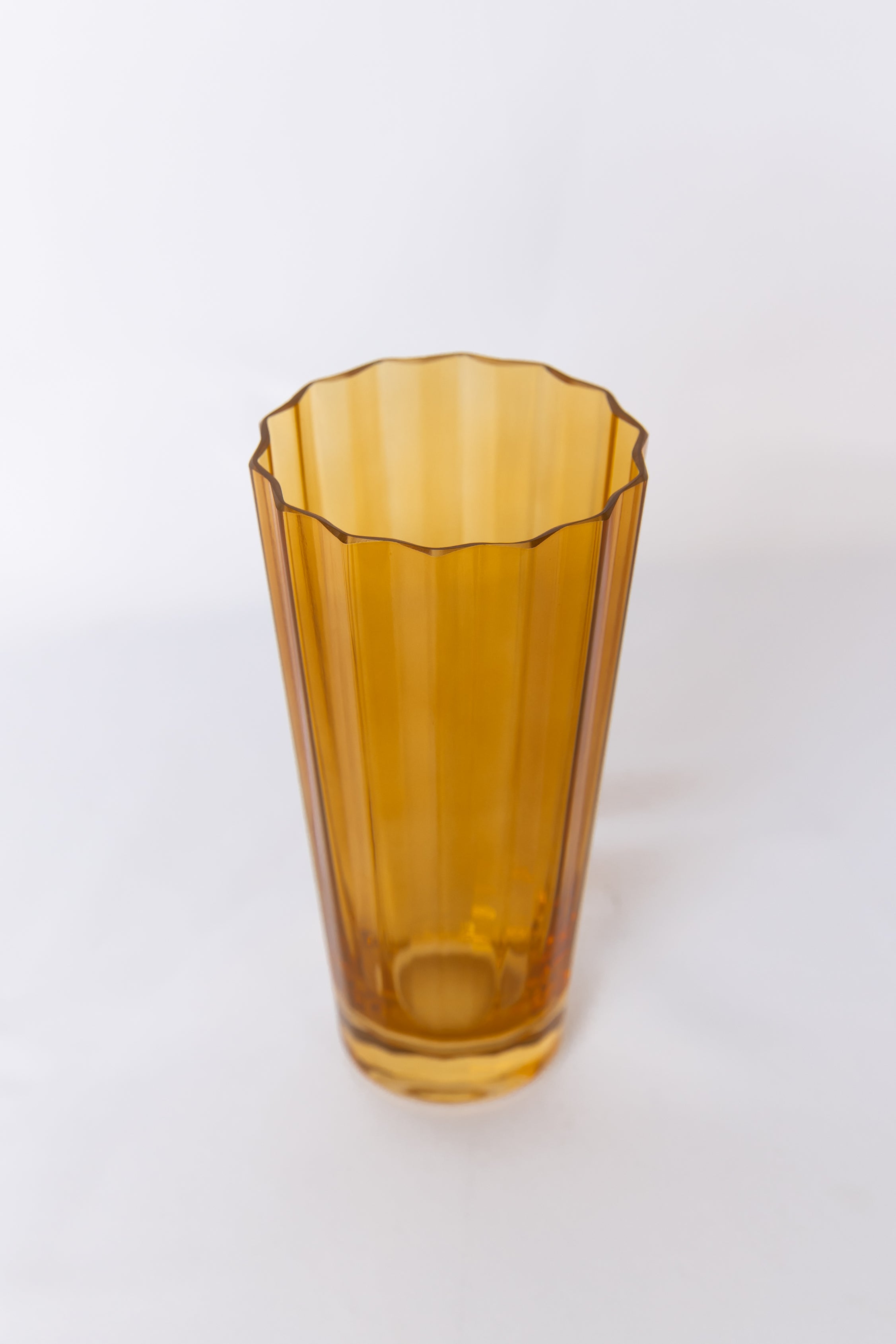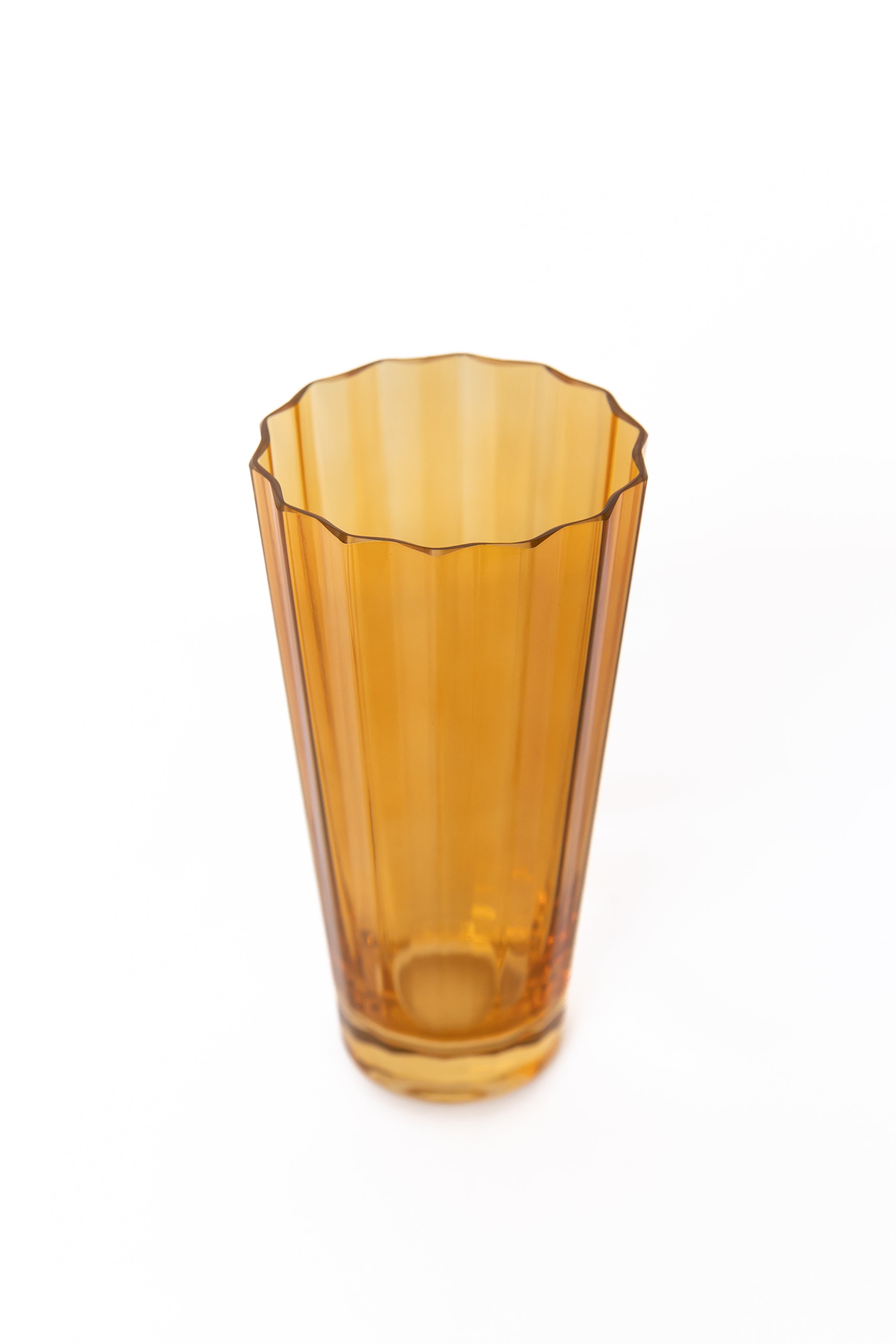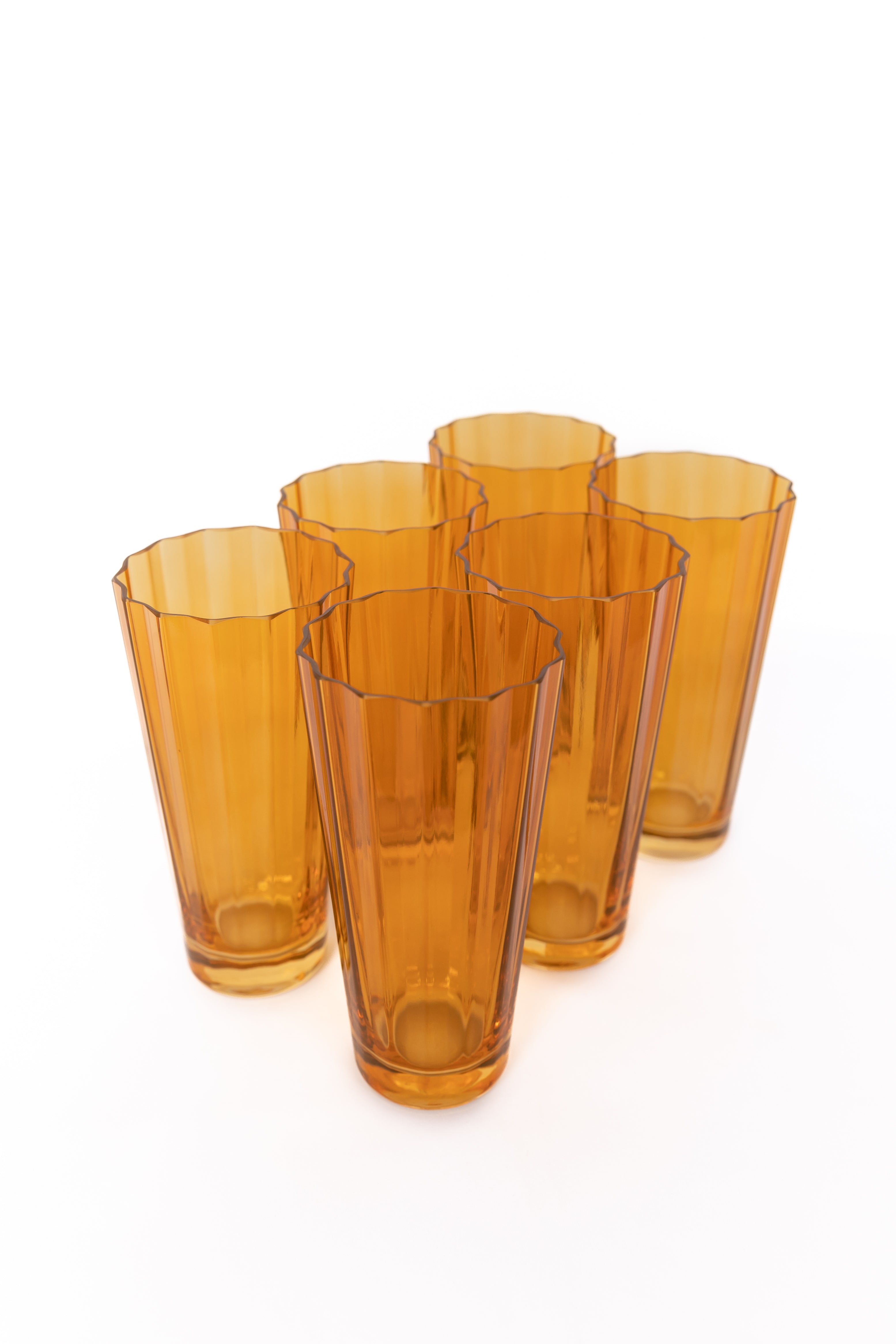 This product is a set of six highball glasses crafted from amber-colored glass. The vertical fluting on the glasses not only adds a decorative element with a play of light but also provides a better grip. These glasses come with either a straight or a scalloped rim, offering different aesthetic and functional options.