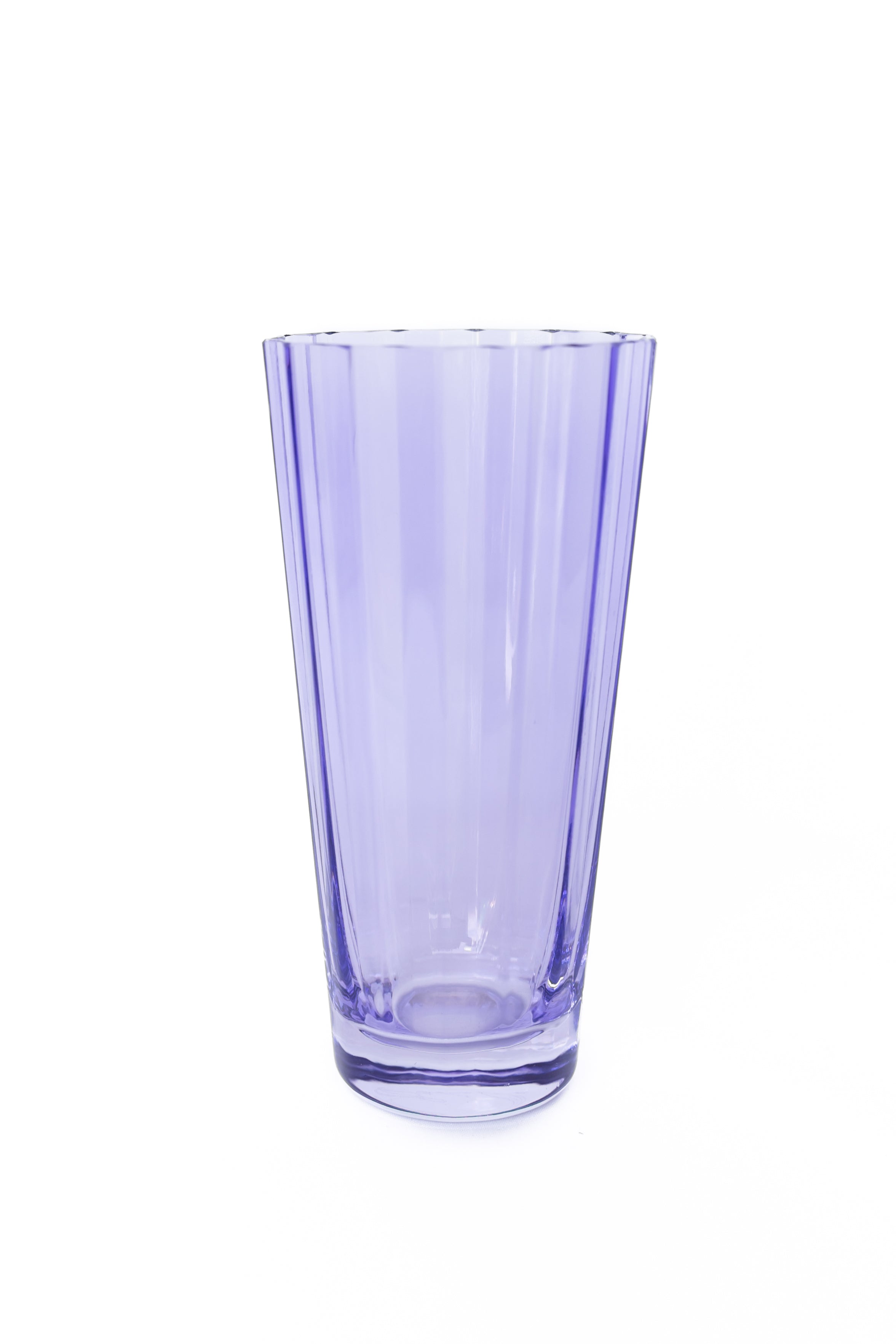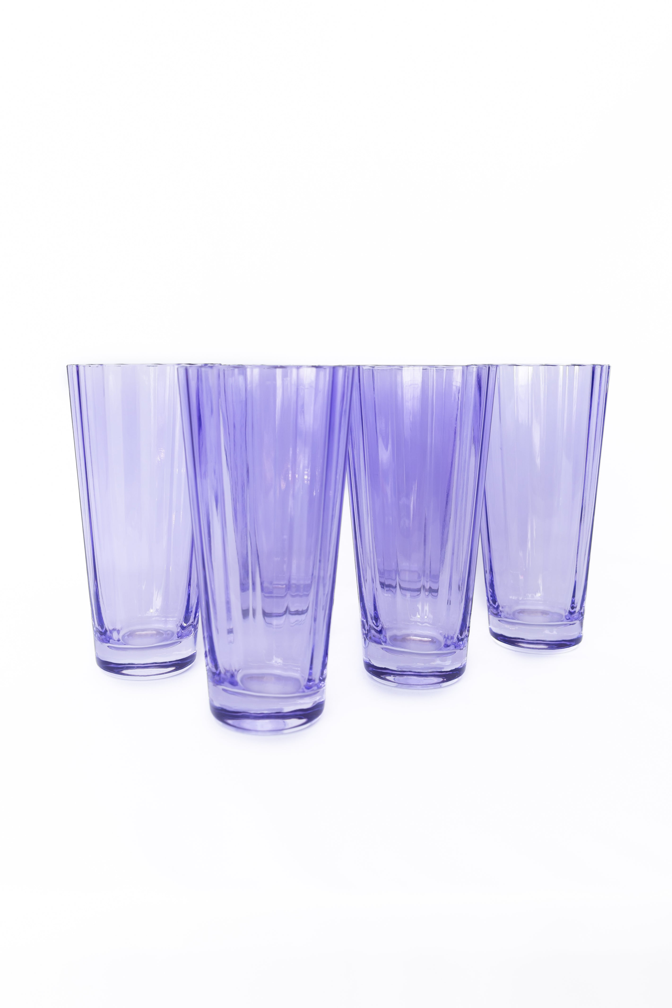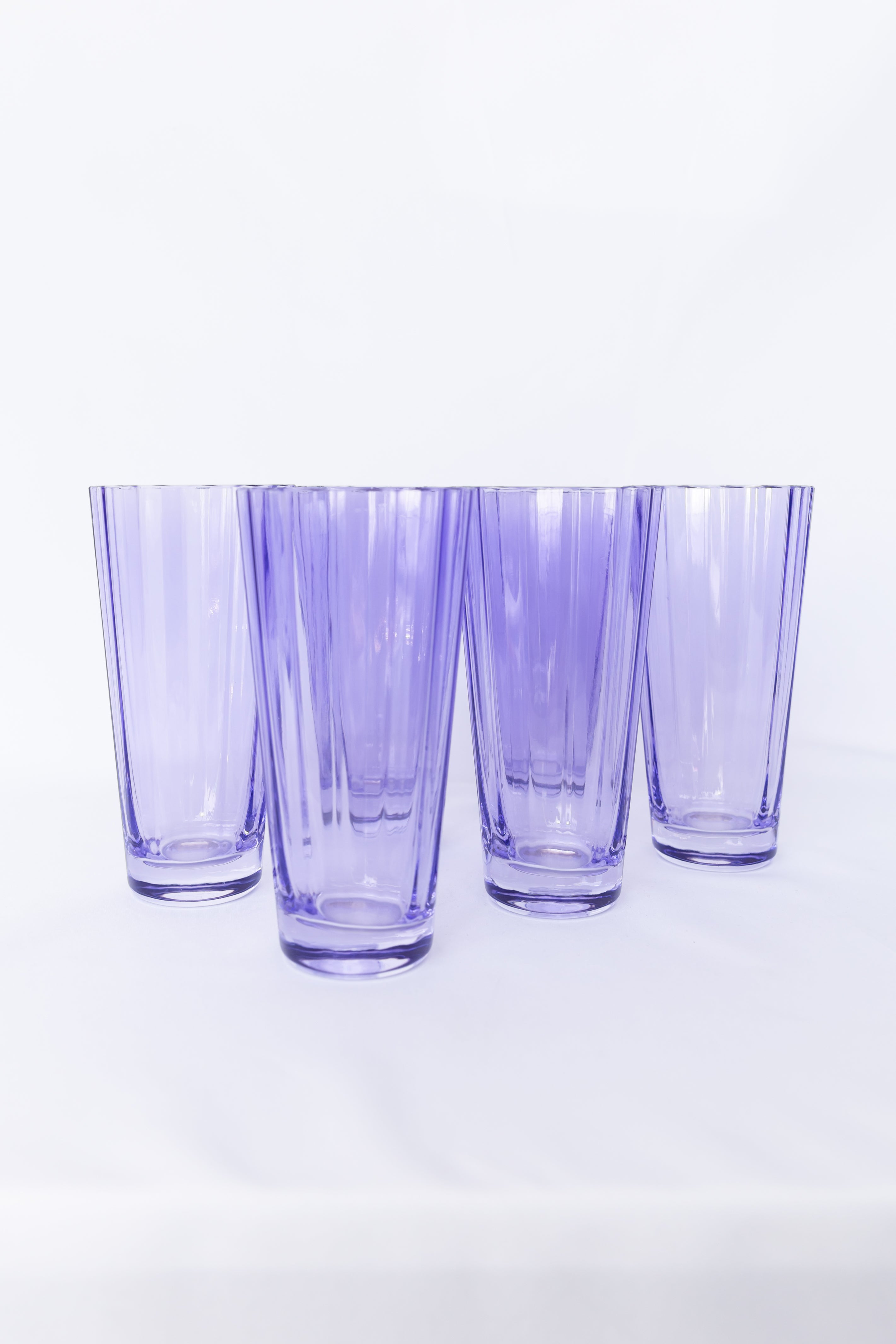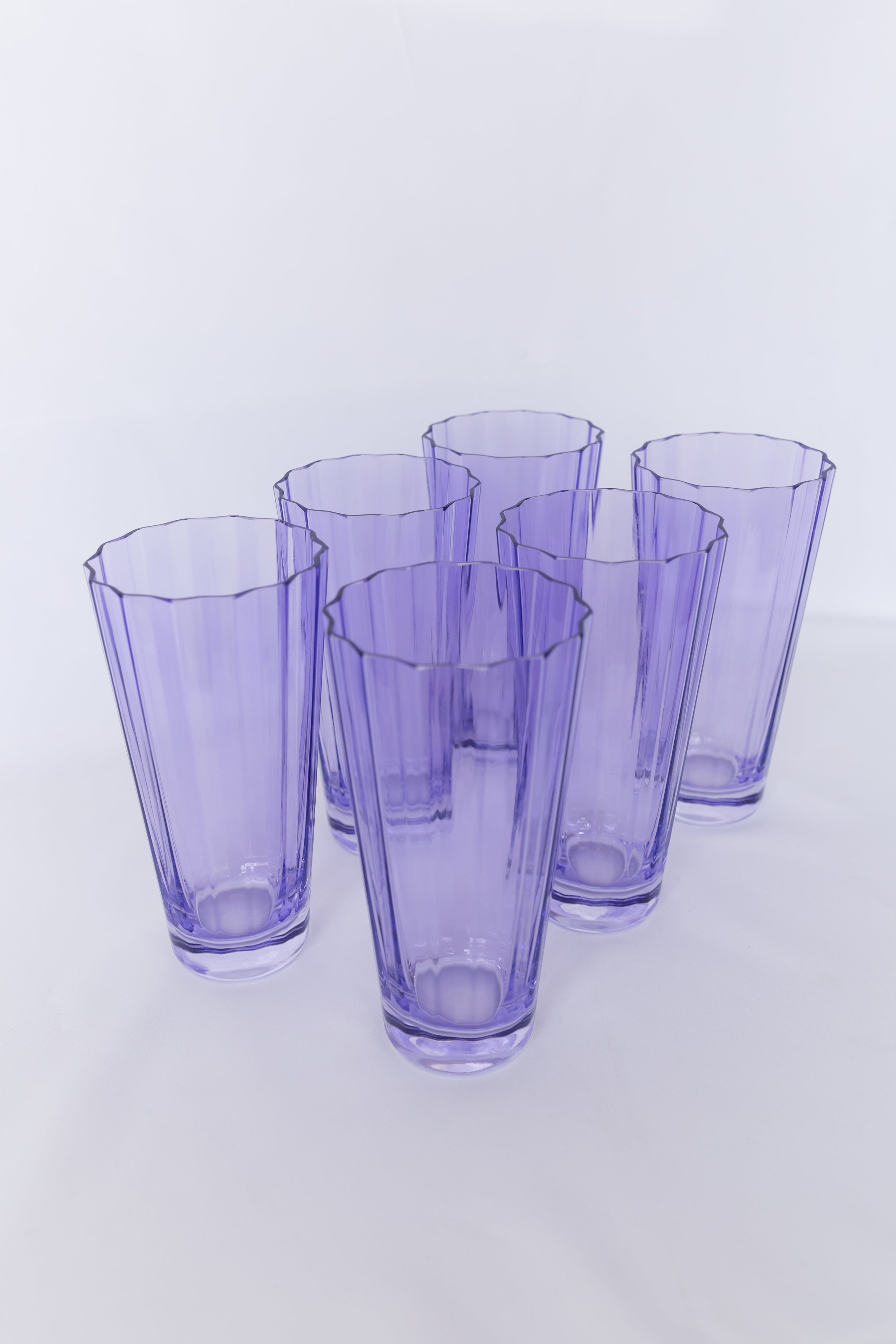 This product is a set of six high – quality drinking glasses. Made of transparent glass with a soft, translucent purple tint, they have a smooth and polished finish. The vertical flutes running the full height of the glass and the scalloped rim add a decorative touch, making them both practical and aesthetically pleasing.