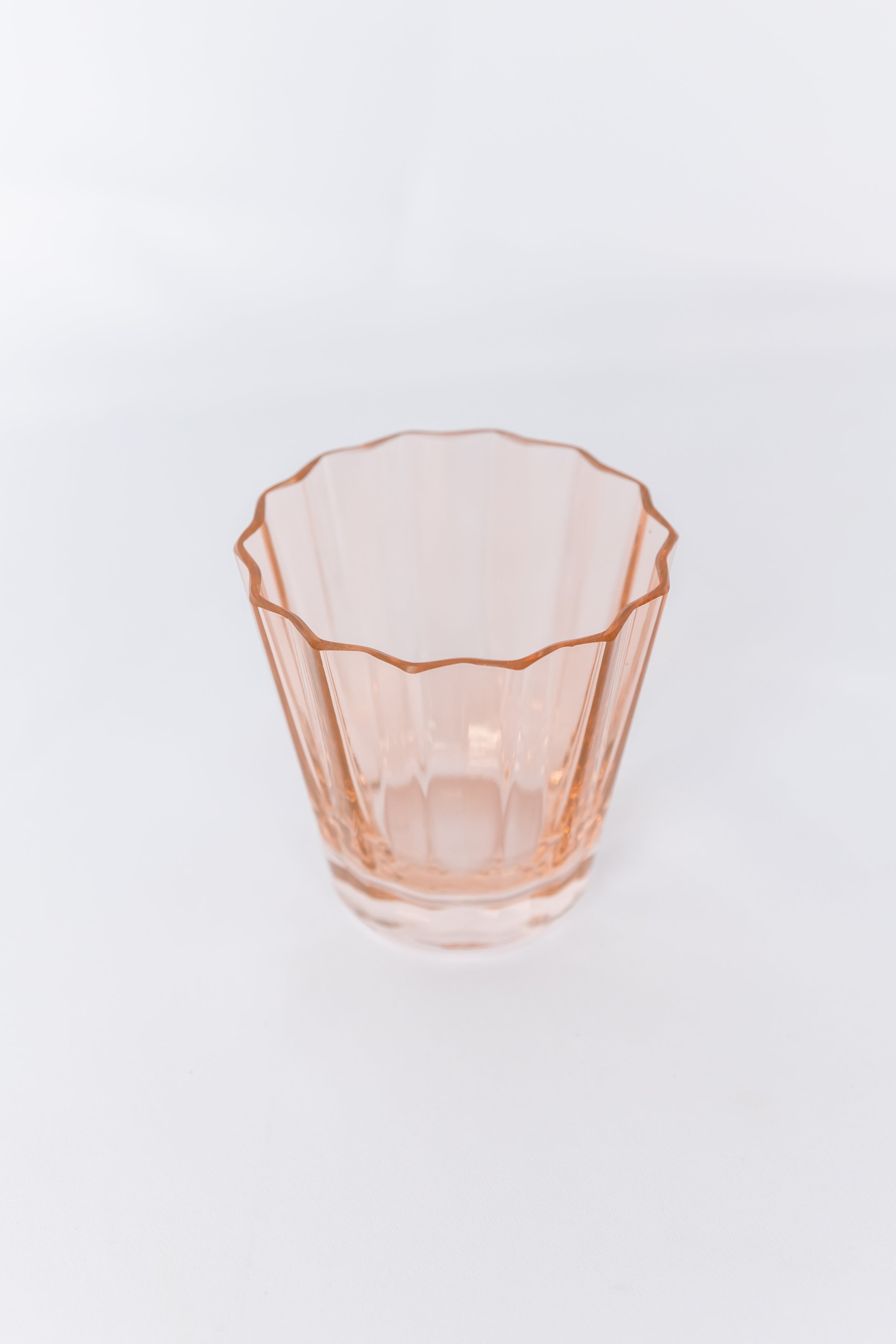 This set includes two drinking glasses made from high – quality colored glass with a soft pink/peach tint. The glasses feature vertical fluted patterns on the sides and a scalloped rim, giving them an elegant and vintage – inspired look. They are short, wide tumblers, perfect for daily beverage consumption.