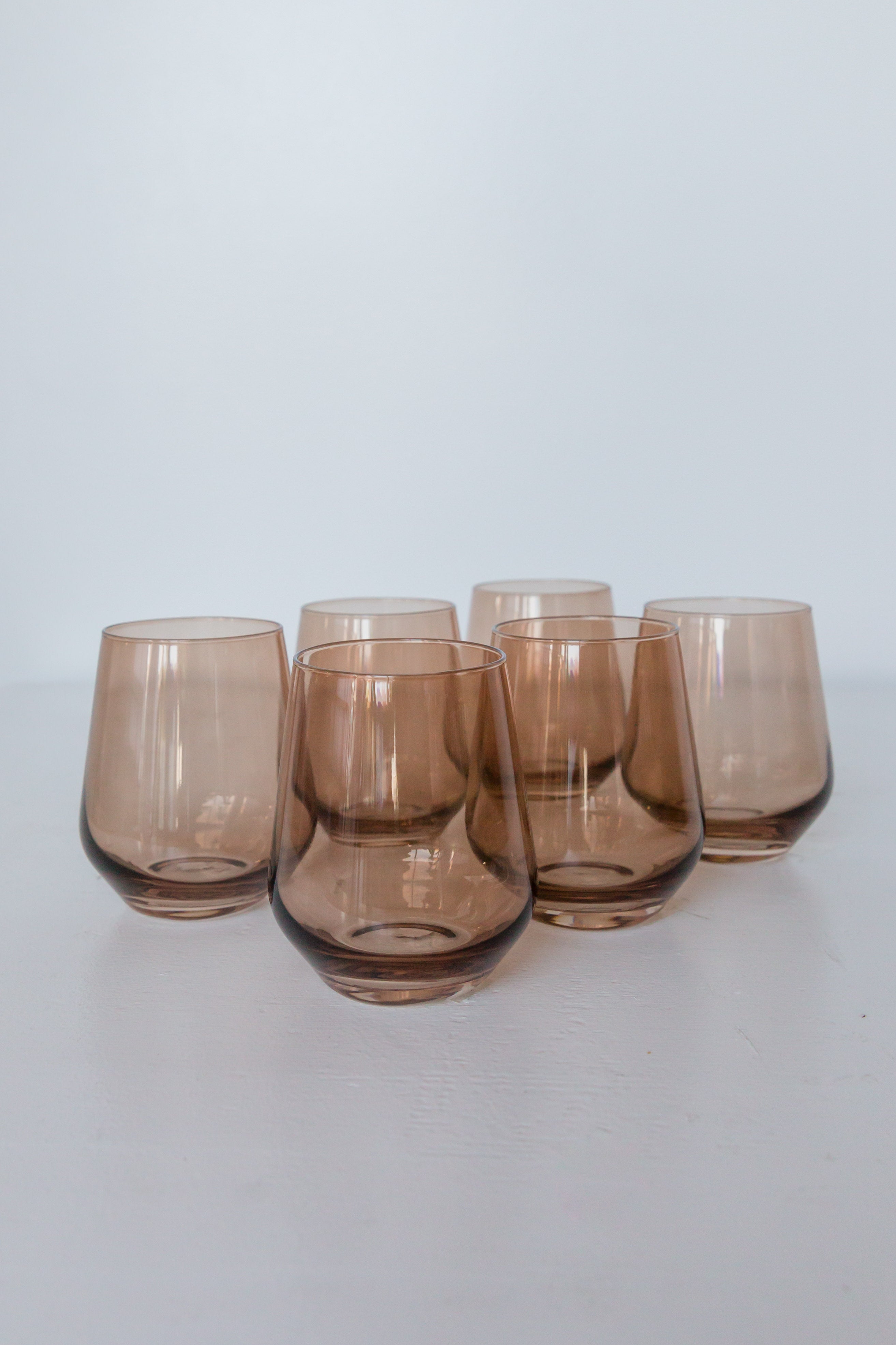 This set includes six stemless drinking glasses made from tinted glass. Hand – blown by artisans in Poland, they have a unique soft amber – brownish – pink hue. With a smooth, curved silhouette that has a wider rounded base tapering towards the rim, these glasses offer a modern and minimalist look, perfect for daily use.