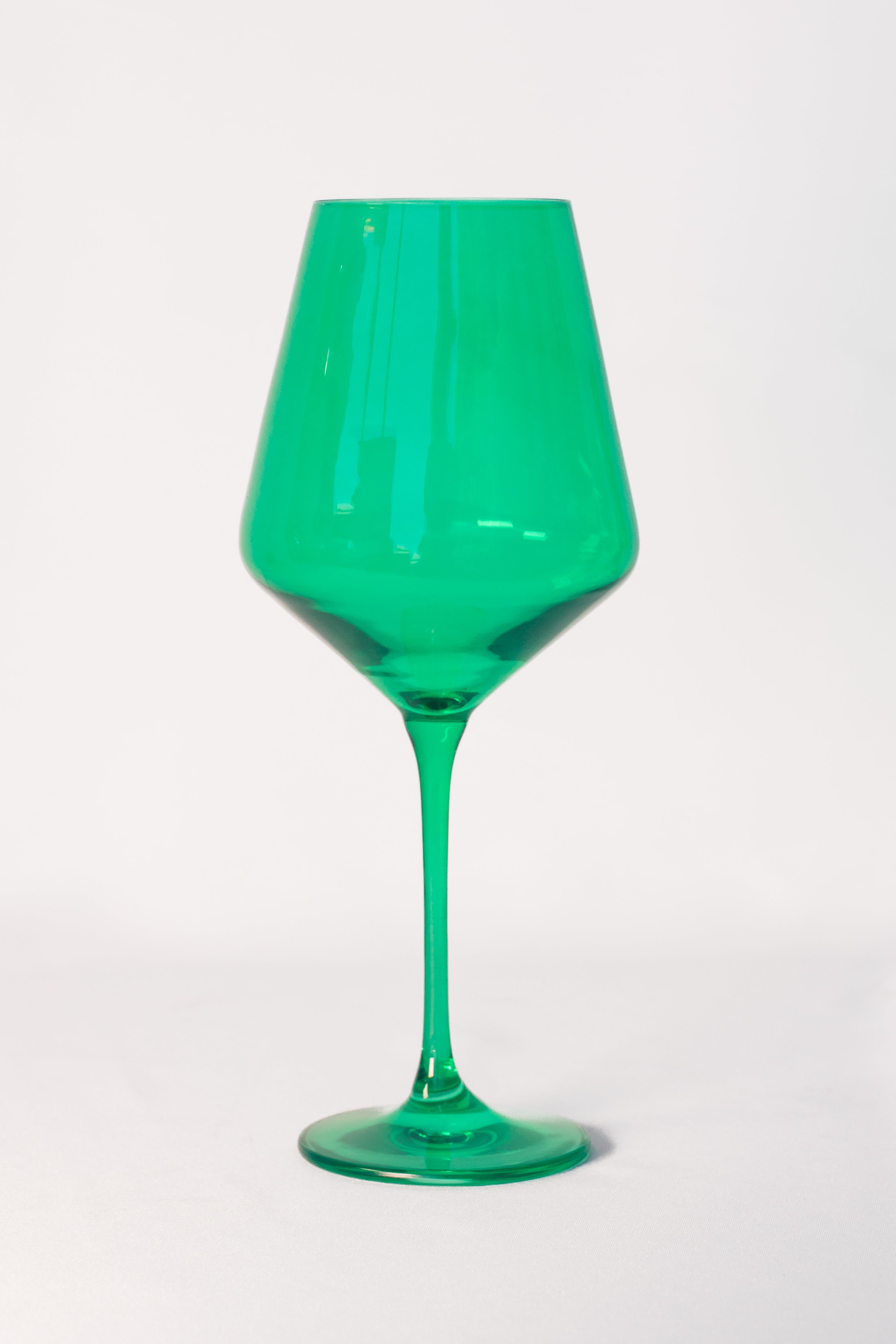 This set comprises two modern wide – bowl wine glasses. Hand – blown by skilled artisans, they are crafted from high – quality colored glass with a vivid emerald green hue. The glasses feature a sleek, minimalist design with a wide, curved bowl, a slender stem, and a broad base, making them suitable for various beverages.