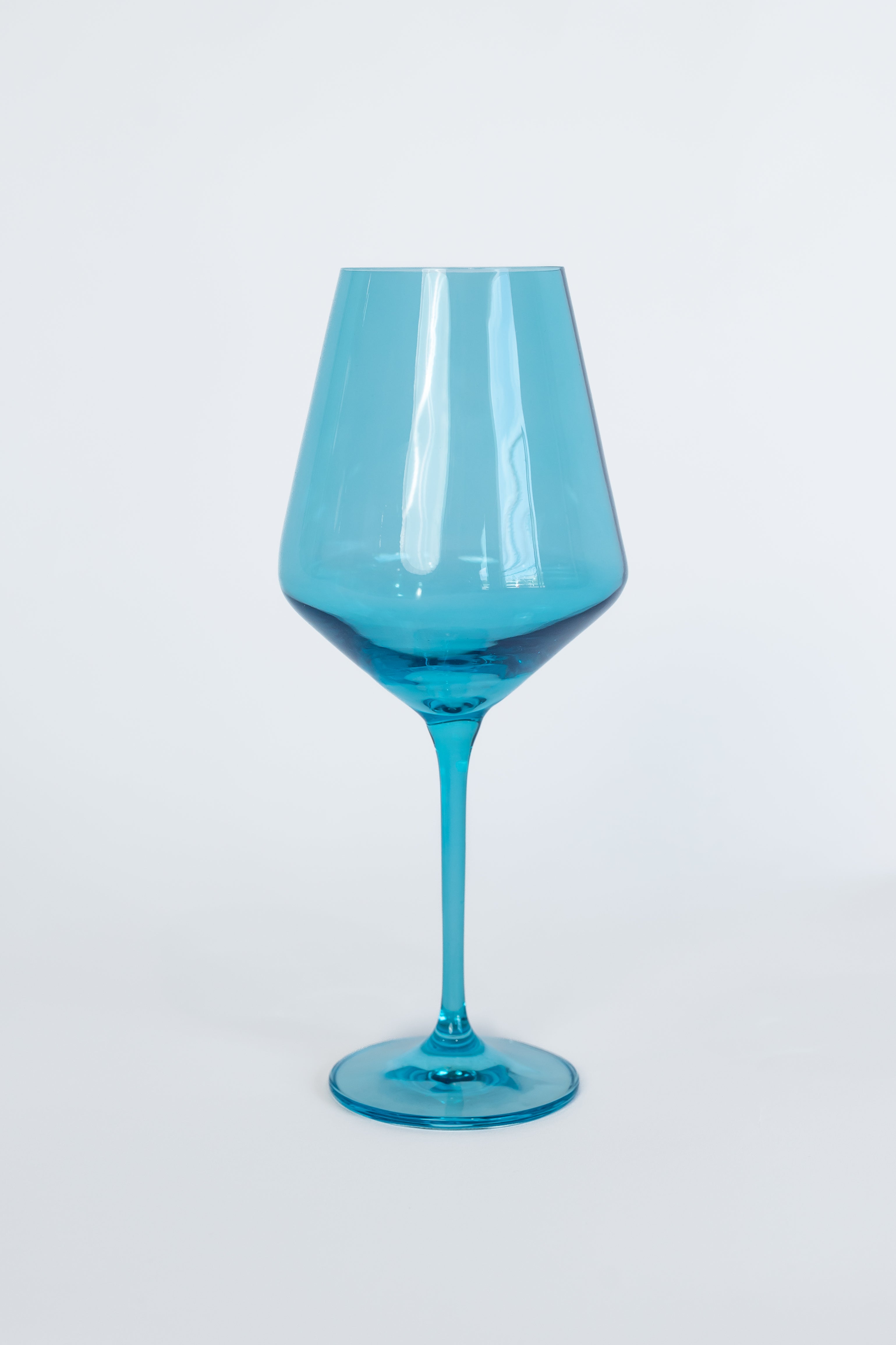 This is a set of two modern stemmed wine glasses. Hand – blown by skilled artisans, they are made from high – quality colored glass with a vibrant, uniform turquoise/bright blue hue. The glasses feature a minimalist design with a tall stem, wide slightly tapering bowl, and a circular base, perfect for enhancing the wine – drinking experience.