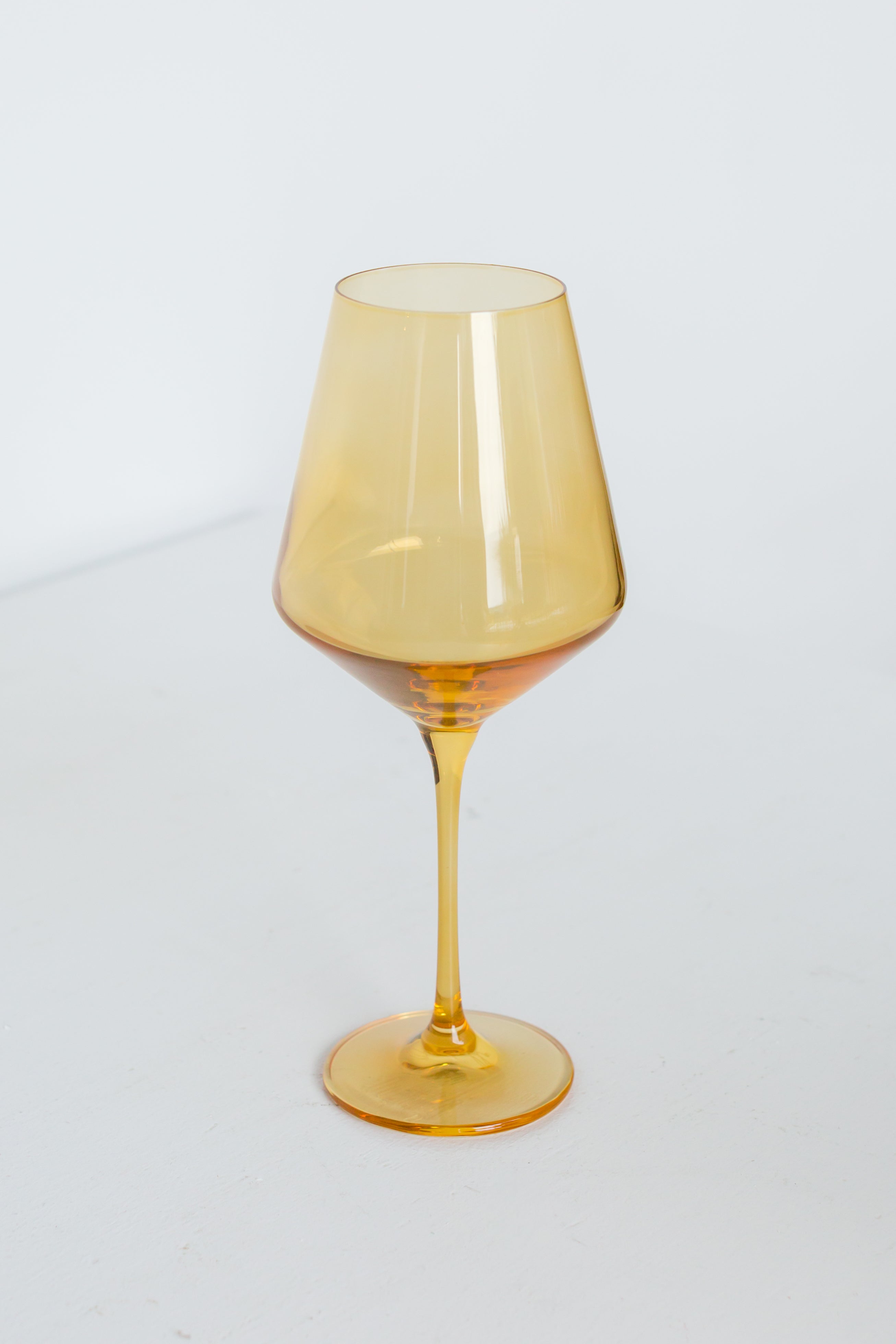 This product is a set of six hand – blown wine glasses crafted by Polish glass artisans. The glasses are made of tinted amber – yellow glass with a clear, smooth finish. Their modern, minimalist design features a wide, conical bowl that tapers slightly towards the rim, a slender stem, and a wide, flat circular base.
